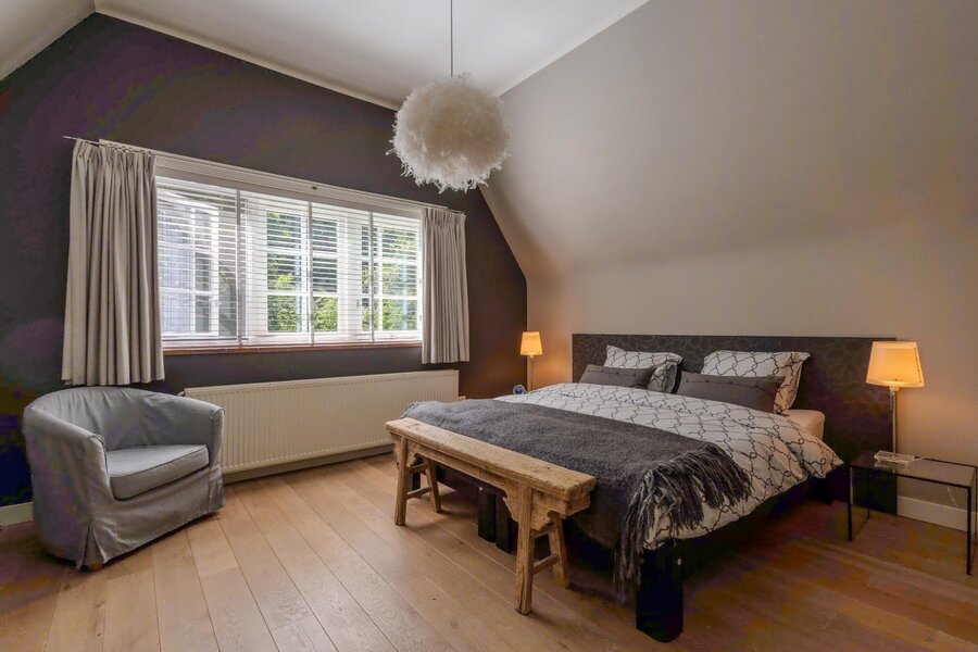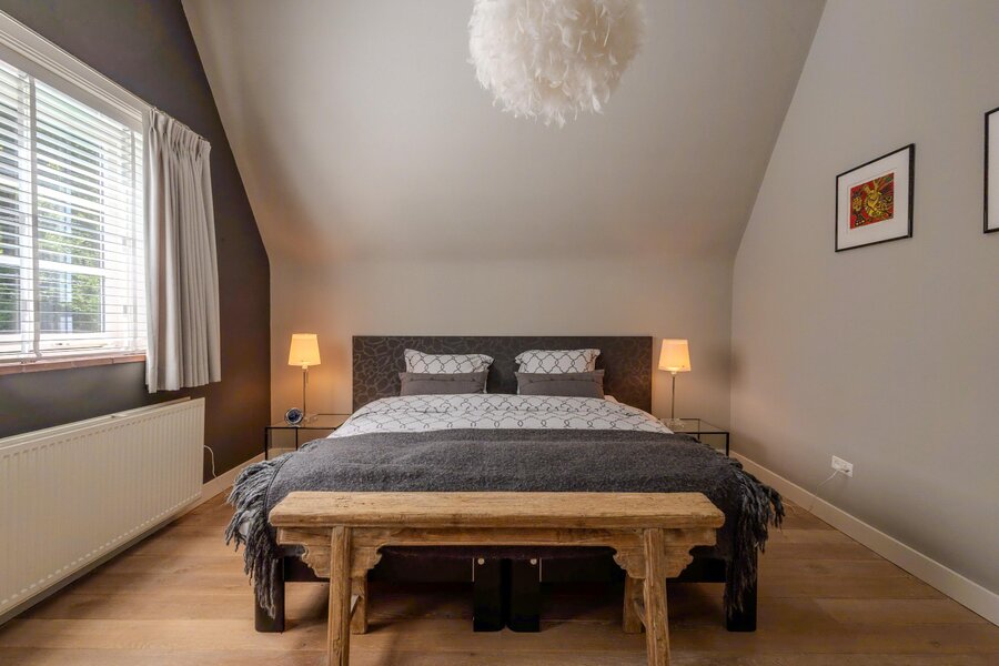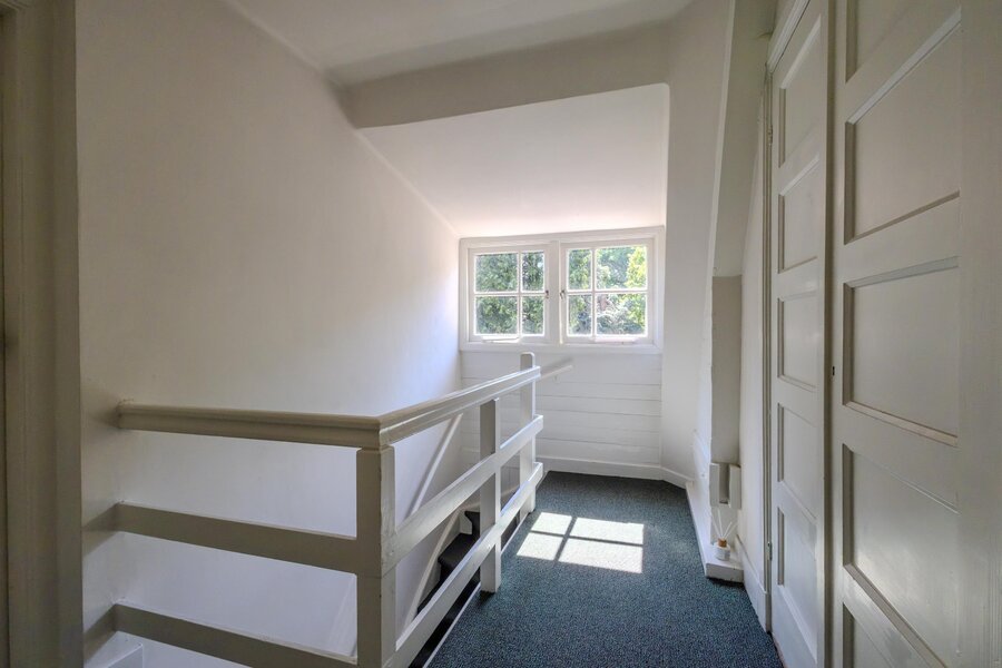 Op de verdieping is nog een afzonderlijke, grote zolderruimte waar de houten gebinten in het zicht zijn gebleven.