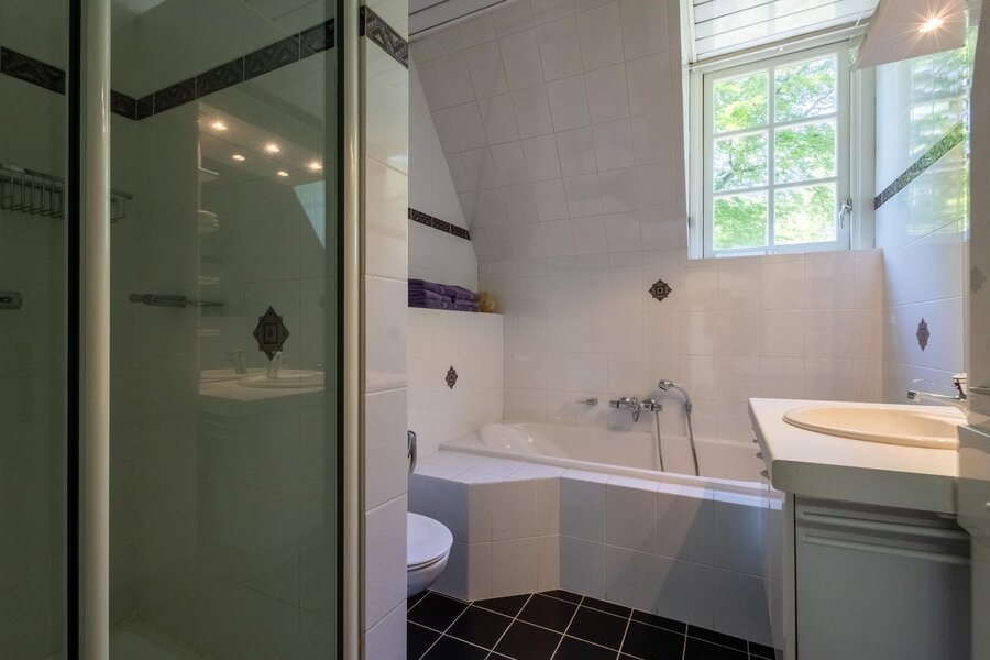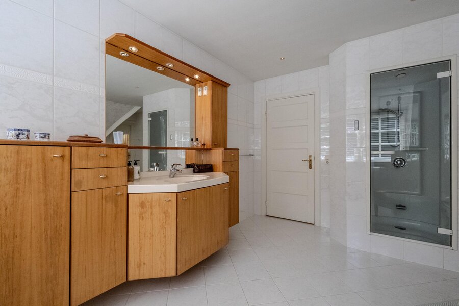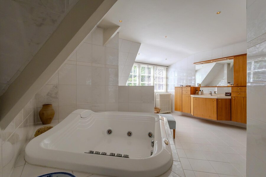 De badkamer en-suite heeft een neutrale kleurstelling en beschikt over een grote jacuzzi, stoomdouche, wastafel met wandmeubel en opbergkast en wandcloset. Er is natuurlijke ventilatie mogelijk via een raam.