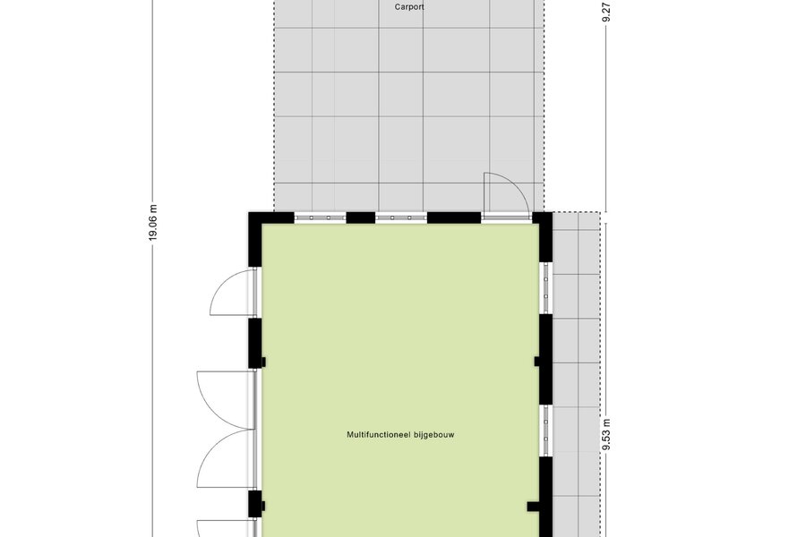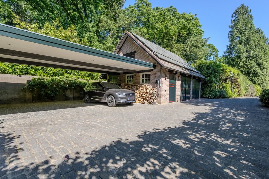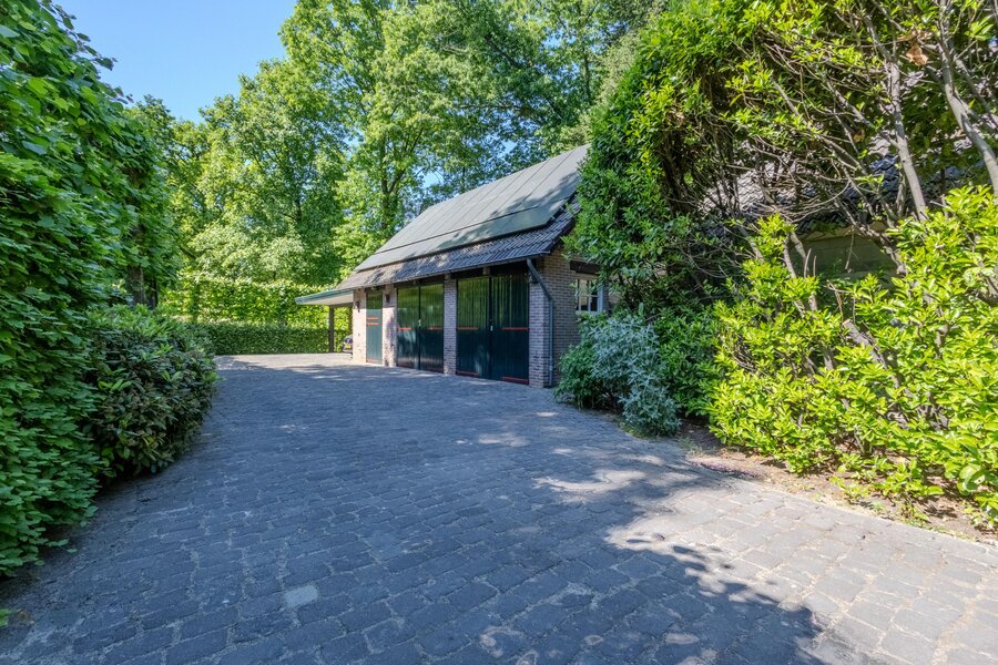 Het multifunctionele, stenen bijgebouw met ruime bergzolder biedt veel ruimte en mogelijkheden en capaciteit voor drie auto’s; houten openslaande deuren geven toegang tot de oprit. Aansluitend nog een carport met drie parkeerplaatsen. Op het dak van het bijgebouw en de carport zijn totaal 32 zonnepanelen geïnstalleerd.