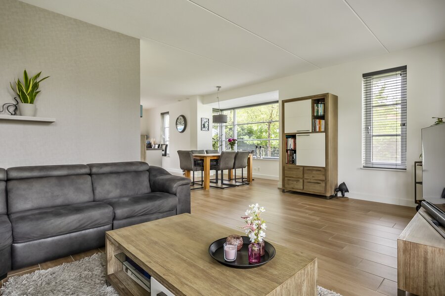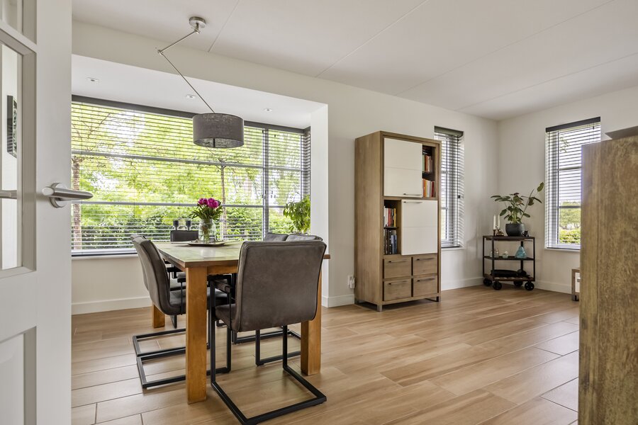 Bij binnenkomst stap je in een ruime hal met een mooie trapopgang en toegang tot het toilet. De hal leidt naar de royale woonkamer van circa 54 m², die dankzij de sfeervolle erker veel daglicht heeft. Hier is genoeg plek voor een royale zithoek en een grote eettafel — ideaal voor gezellige etentjes of relaxte avonden thuis.