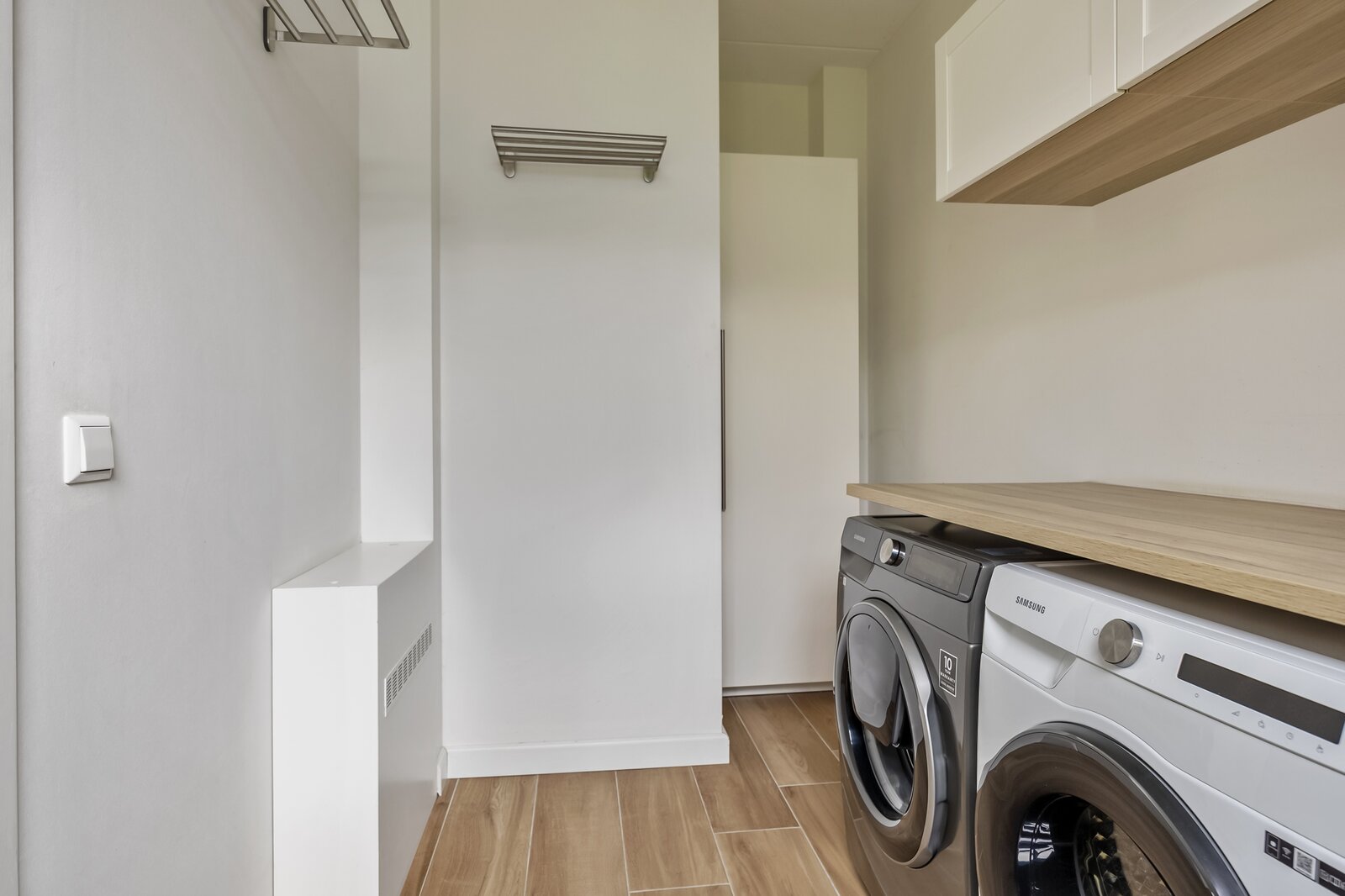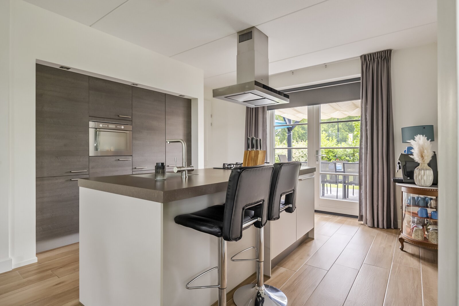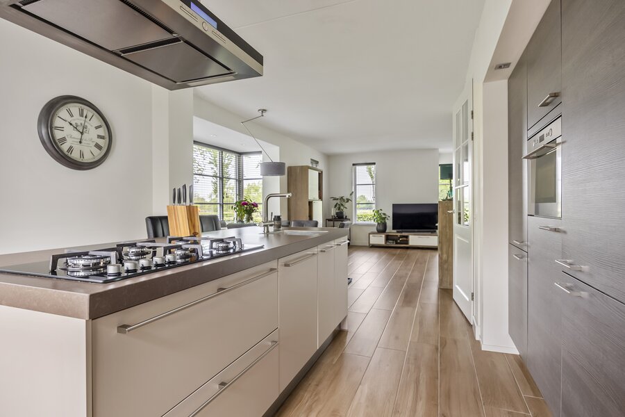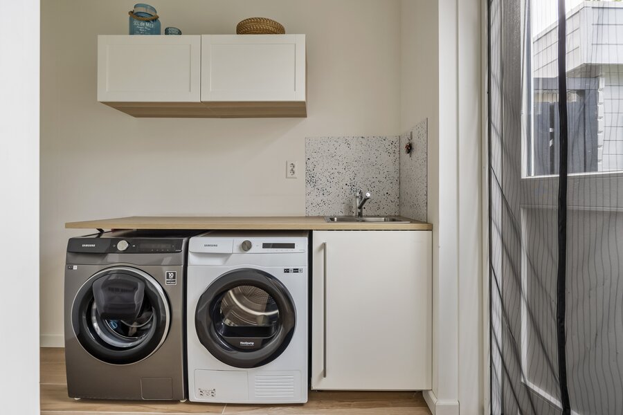 De moderne open keuken is voorzien van alle benodigde inbouwapparatuur en sluit naadloos aan op de bijkeuken. Deze bijkeuken fungeert tevens als wasruimte, waardoor je wasmachine en droger netjes uit het zicht staan.