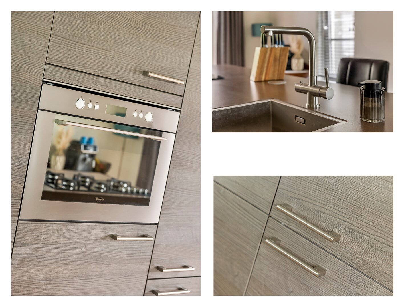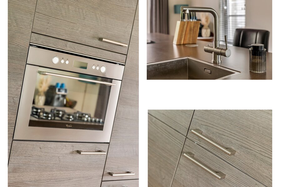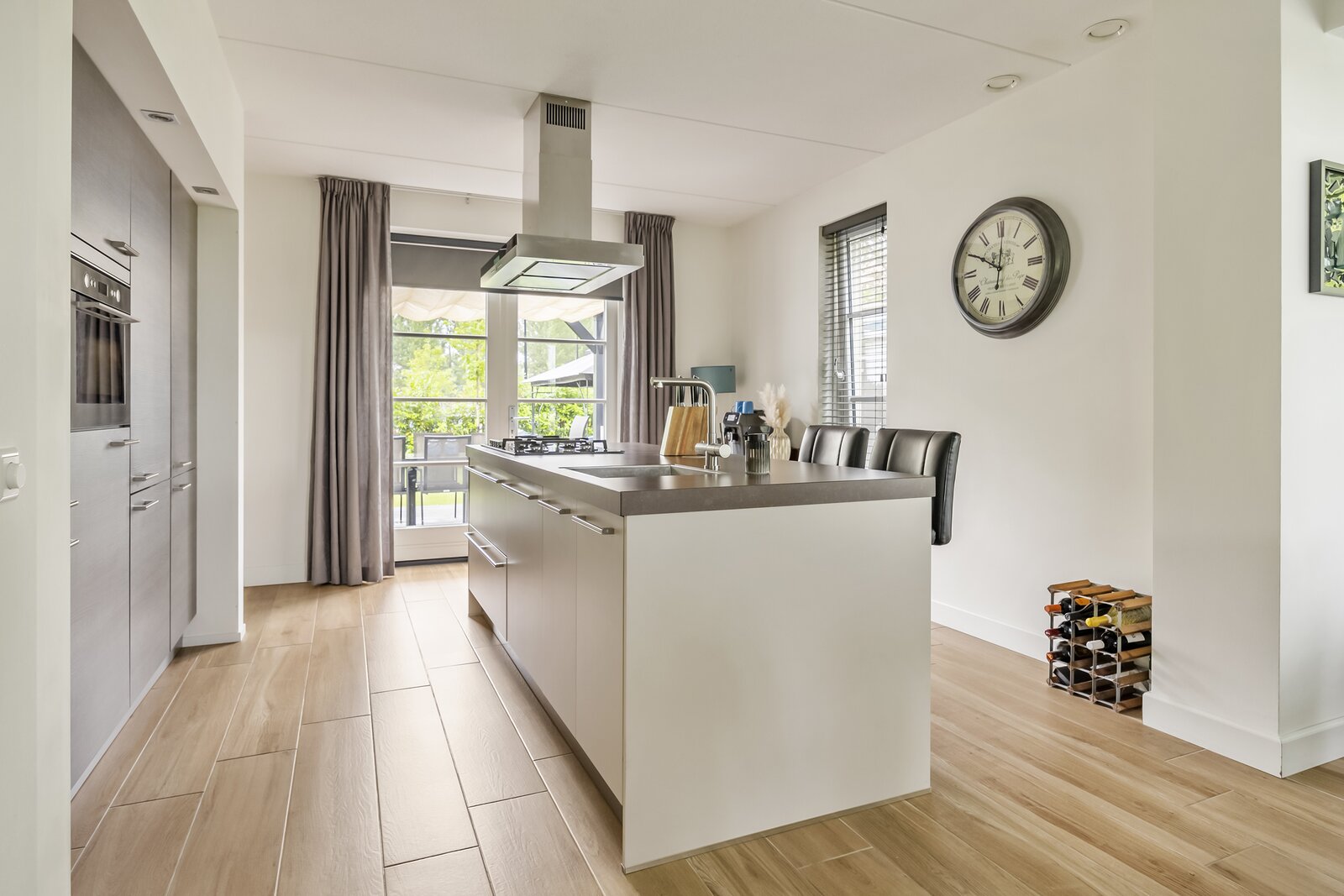 De moderne open keuken is voorzien van alle benodigde inbouwapparatuur en sluit naadloos aan op de bijkeuken. Deze bijkeuken fungeert tevens als wasruimte, waardoor je wasmachine en droger netjes uit het zicht staan.