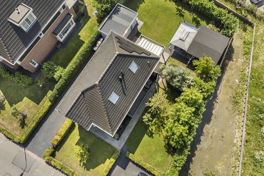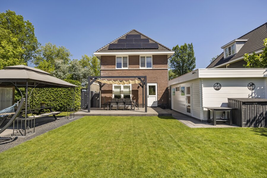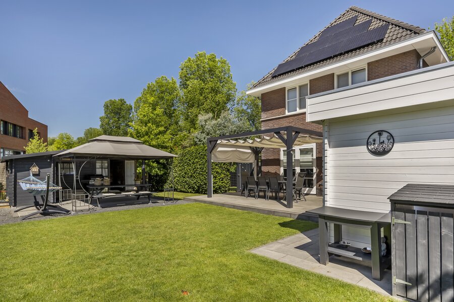 De tuin rondom de woning is met zorg aangelegd en biedt volop ruimte en privacy. Aan de achterzijde vind je een heerlijk zonneterras, perfect voor lange zomeravonden of een rustige ochtendkoffie. Het tuinhuis in de tuin is momenteel ingericht als stoere mancave, compleet met verwarming en elektra.