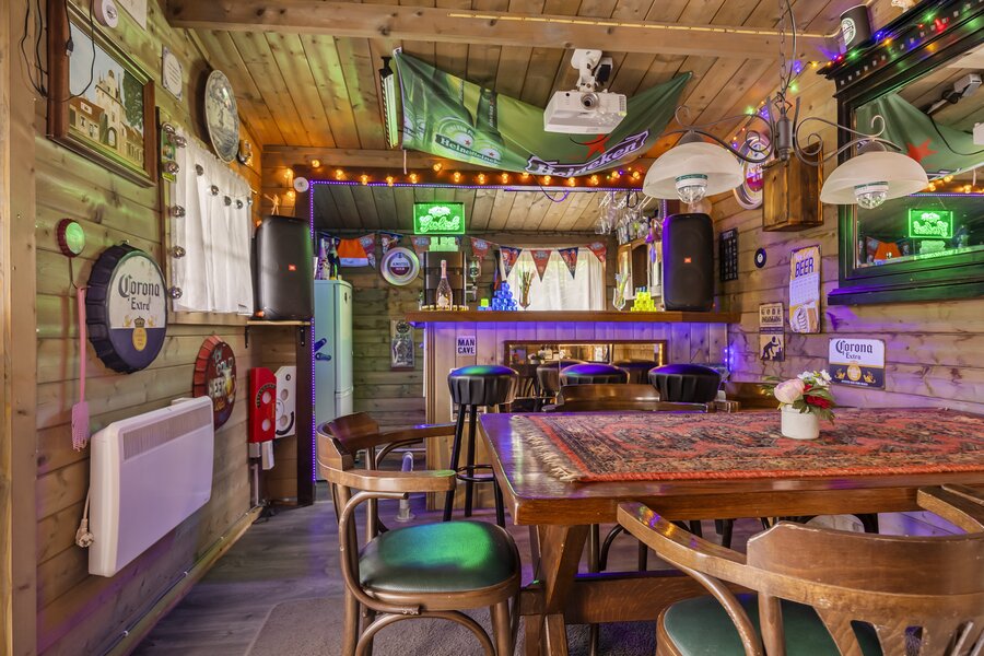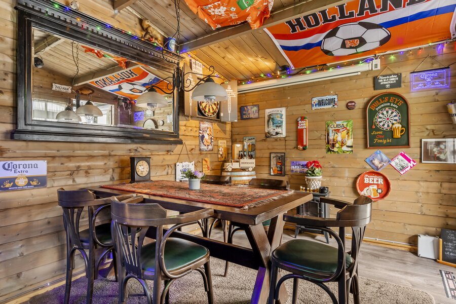 - Vrijstaand houten tuinhuis, ingericht als gezellige mancave