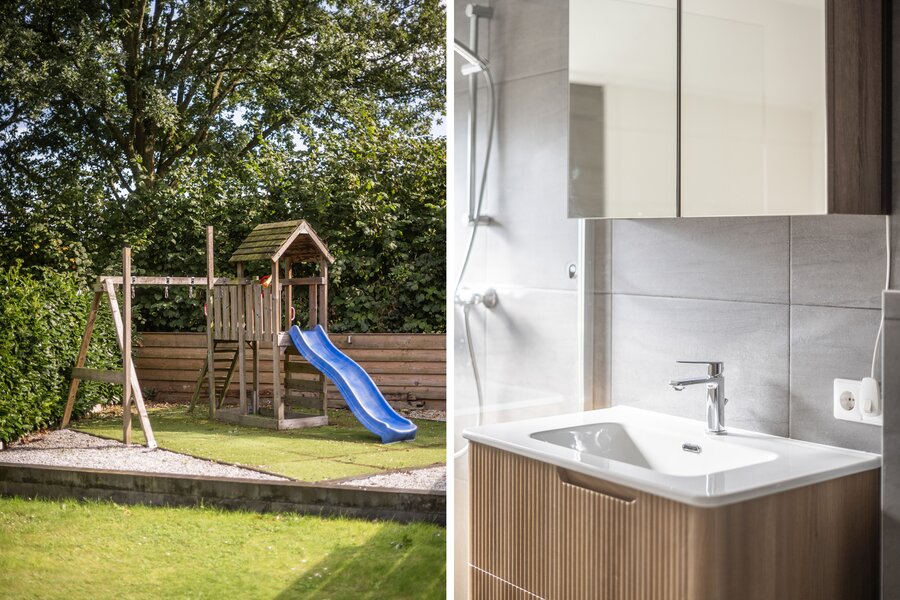 De tuin is een grote verrassing! Via de rechterkant van de woning, waar je ook kunt parkeren, kom je in ‘jouw deel’ van de tuin. Naast het huis vind je al een fijne plek om te zitten, hier kom je ook via de openslaande deuren in de woonkamer. En de tuin loopt een heel stuk door naar achter, waar hij over de volle breedte van de kavel strekt. Een mooie brede tuin met een groot gazon, een plek achterin de tuin om te zitten en spelen. Er is een houten berging achterin de tuin voor de extra spullen. De tuin biedt veel privacy, en de ligging op het zuiden is perfect…
