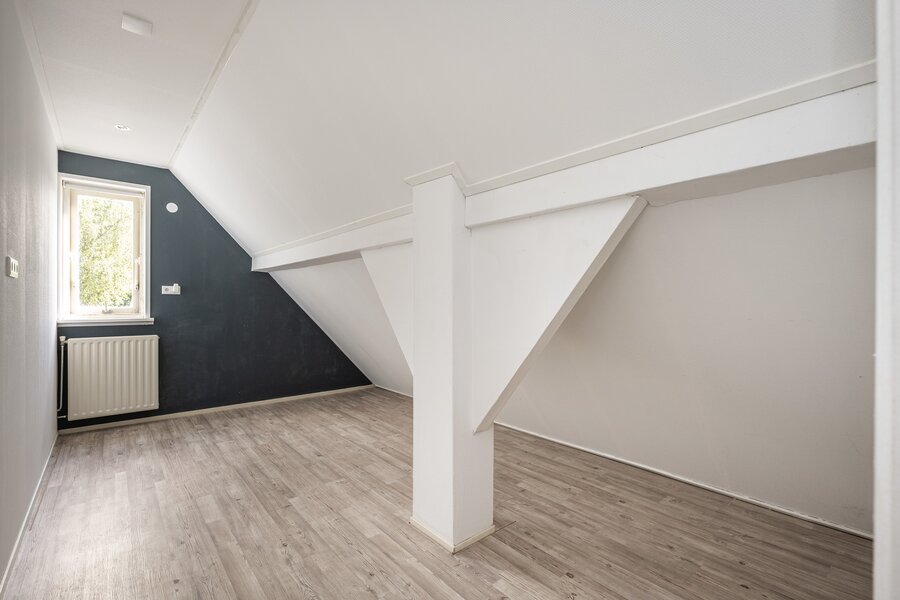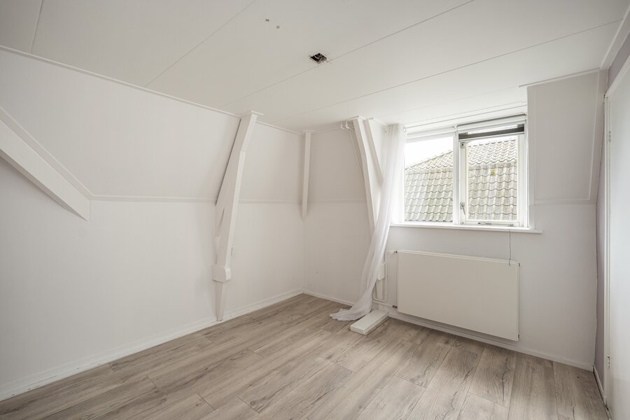 Via de trap kom je op de overloop van de verdieping. Er zijn drie slaapkamers en een zeer ruime badkamer. De slaapkamers zijn voorzien van praktische vaste kasten en zijn sfeervol en speels door de ligging onder het afgeknotte schilddak. De badkamer is wat ouder maar een heerlijke plek om te badderen, met een aparte inloopdouche, dubbele wastafels, een tweede toilet en extra kastruimte. Bovendien is hier ook een raam dat zorgt voor daglicht en frisse lucht.