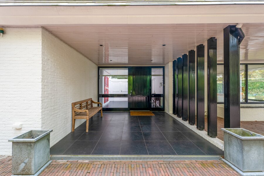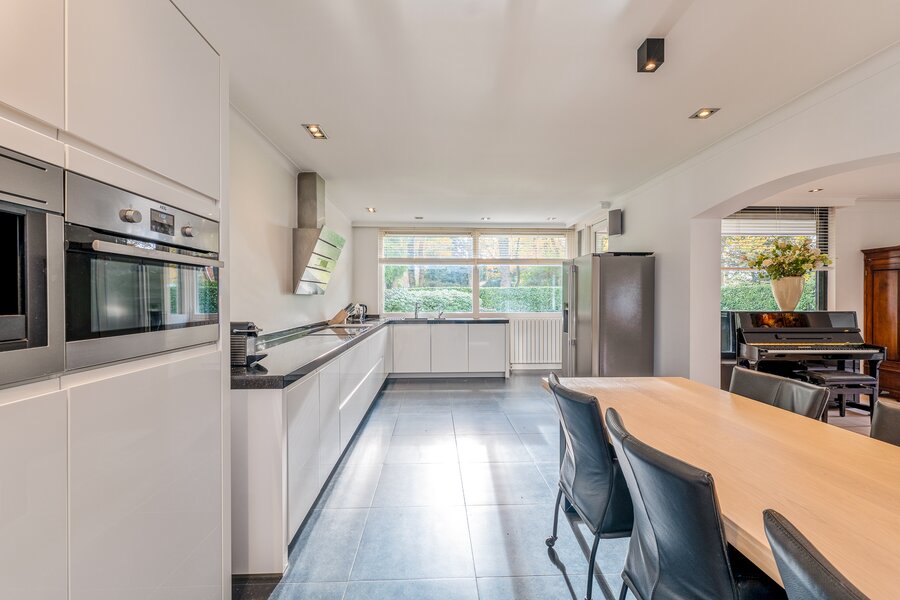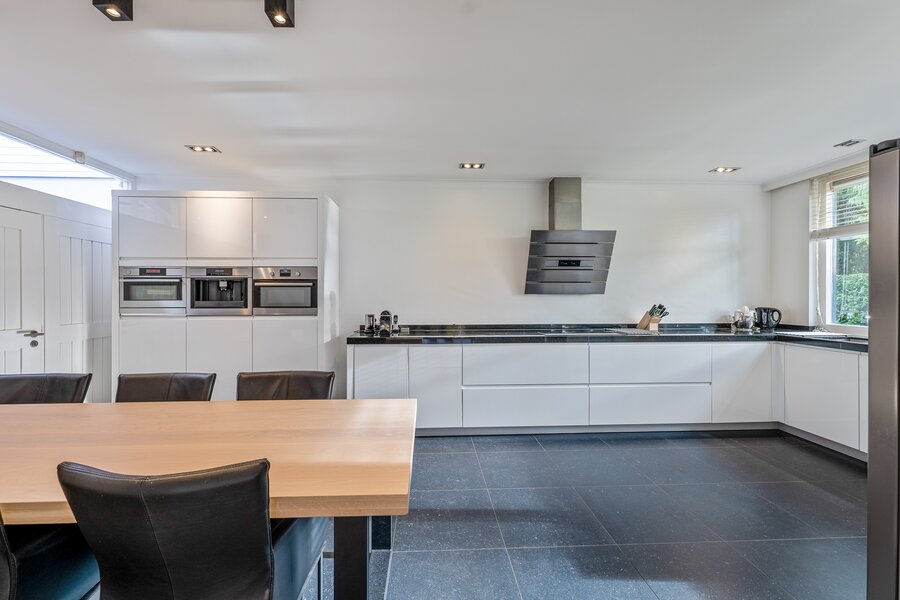 Bij binnenkomst valt direct de royale hal op, die dankzij grote ramen bijzonder licht is. Hier bevinden zich de garderobe en een zeer ruim toilet met urinoir. De ruime leefkeuken is uitgerust met diverse inbouwapparatuur, waaronder een Quooker, magnetron en heteluchtoven. Aansluitend ligt de sfeervolle woonkamer met een fraaie open haard en een tv-hoek. Grote ramen bieden een prachtig zicht op de tuin en de aangrenzende weilanden. Vanuit de woonkamer is er toegang tot het zonnige, op het zuiden gelegen terras.