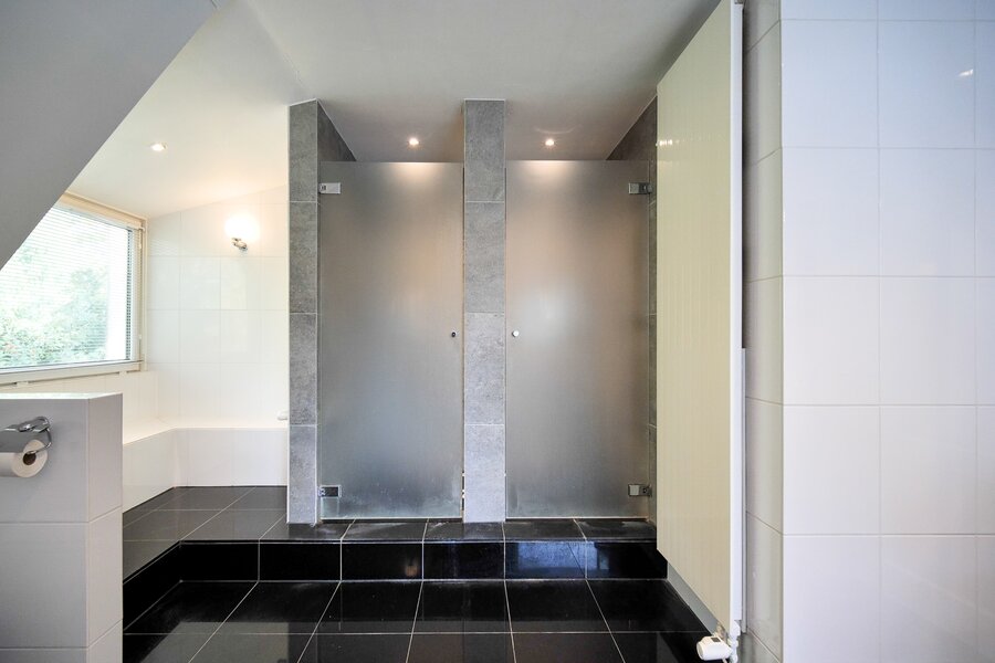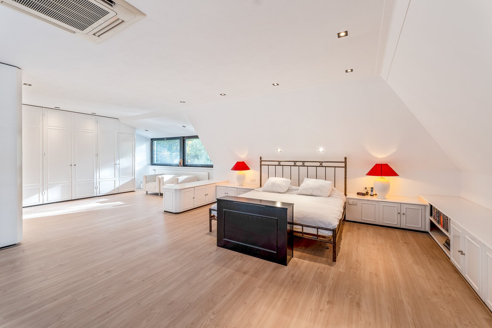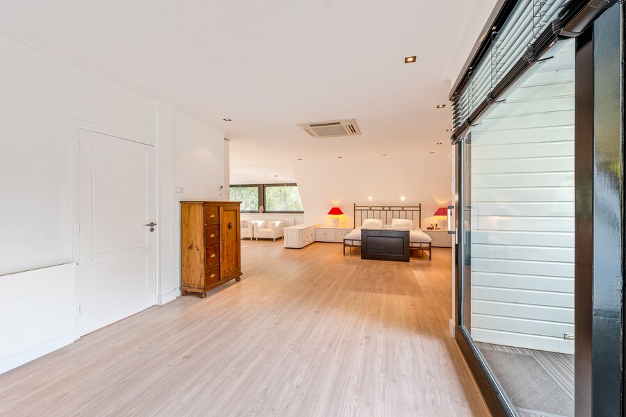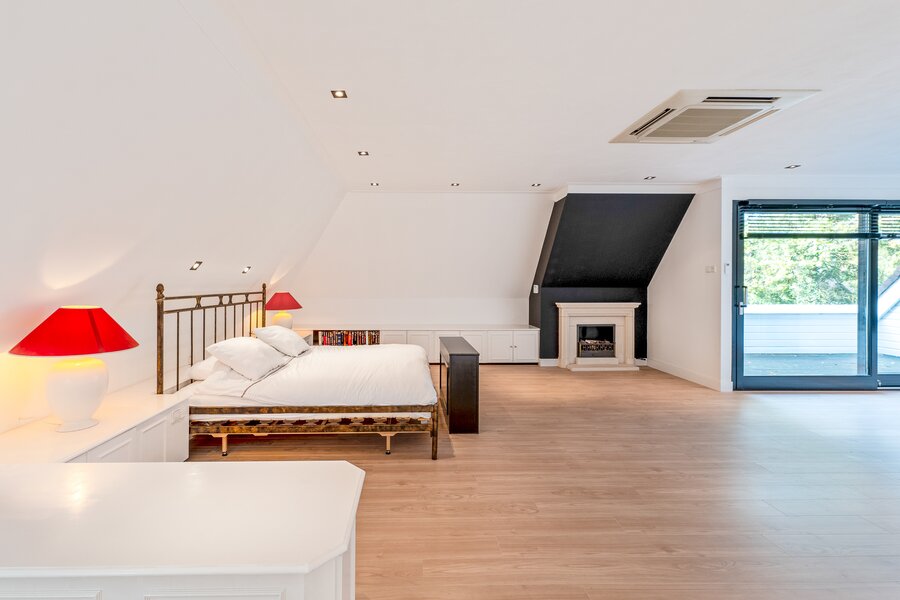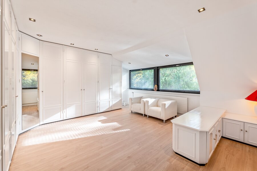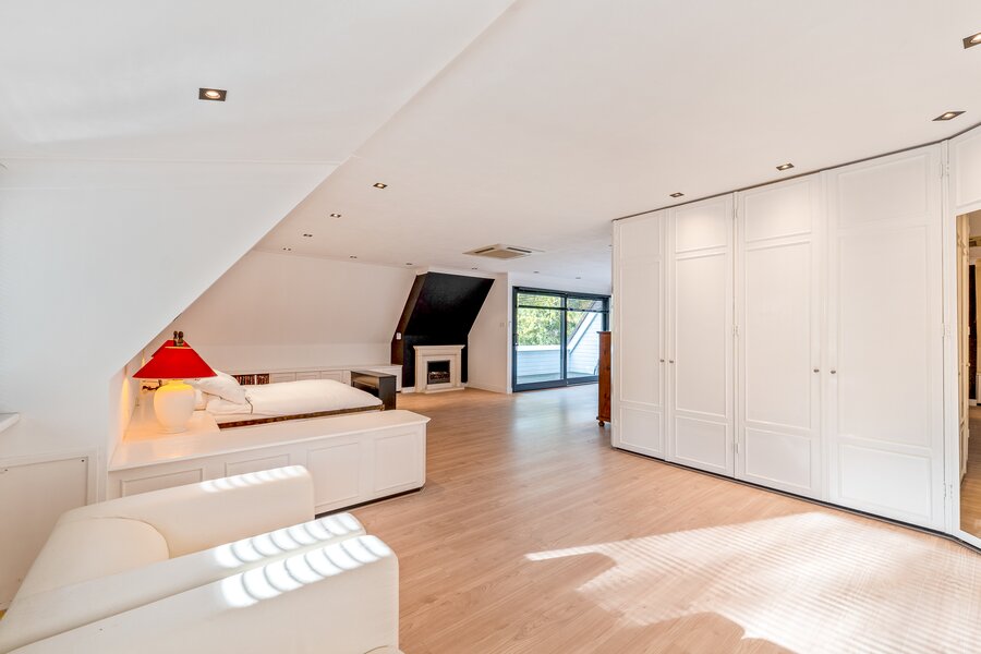 Op de verdieping bevindt zich een bijzonder royale ouderslaapkamer van circa 65 m², compleet met inbouwkasten, een zithoek met gashaard, airconditioning en panoramisch uitzicht over Naarden-Vesting. Vanuit deze kamer is er toegang tot de luxe badkamer, die is voorzien van een whirlpool, dubbele inloopdouche, sauna, dubbele wastafels en toilet. Op deze verdieping liggen tevens een wasruimte met aansluitingen voor wasmachine en droger, een tweede ruime slaapkamer met bergruimte achter de knieschotten, en een derde slaapkamer met een inbouwkast.