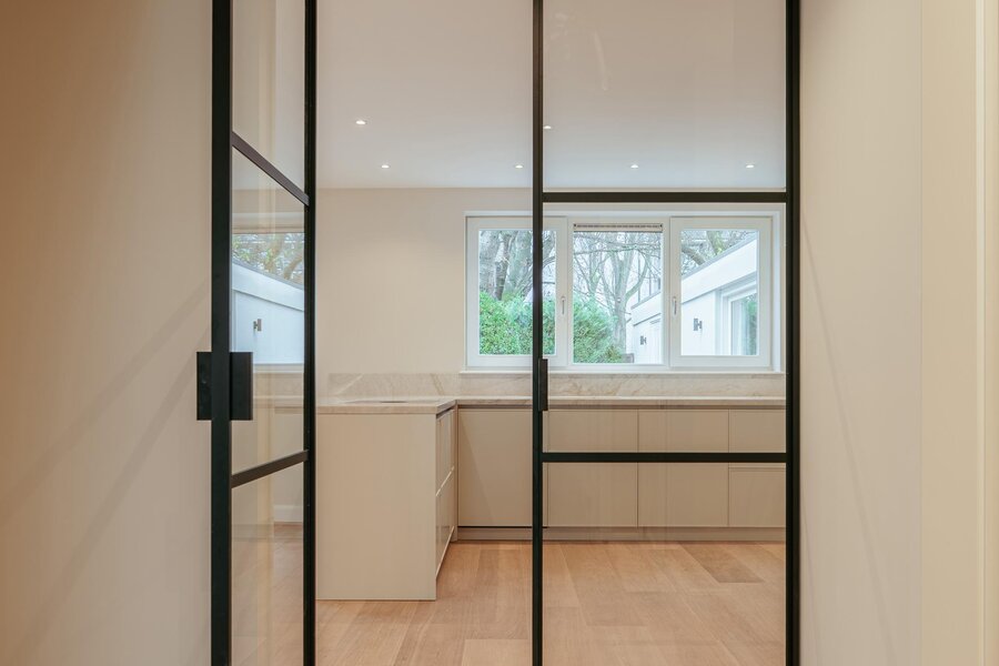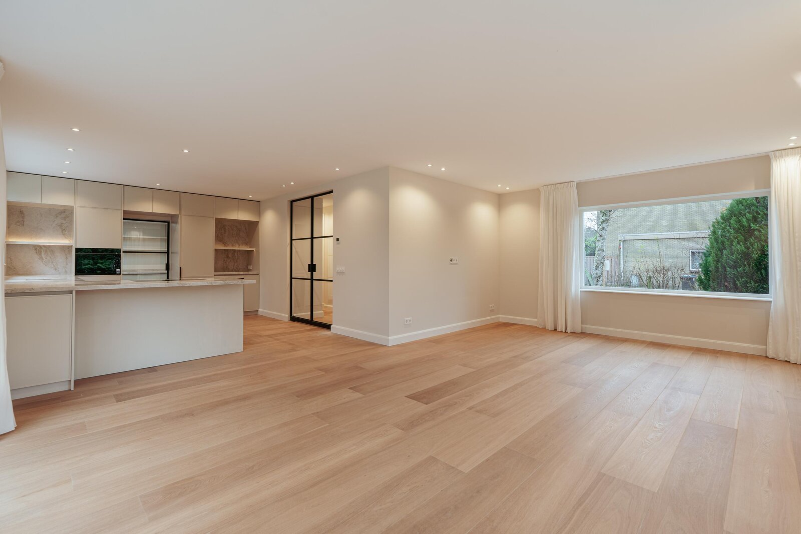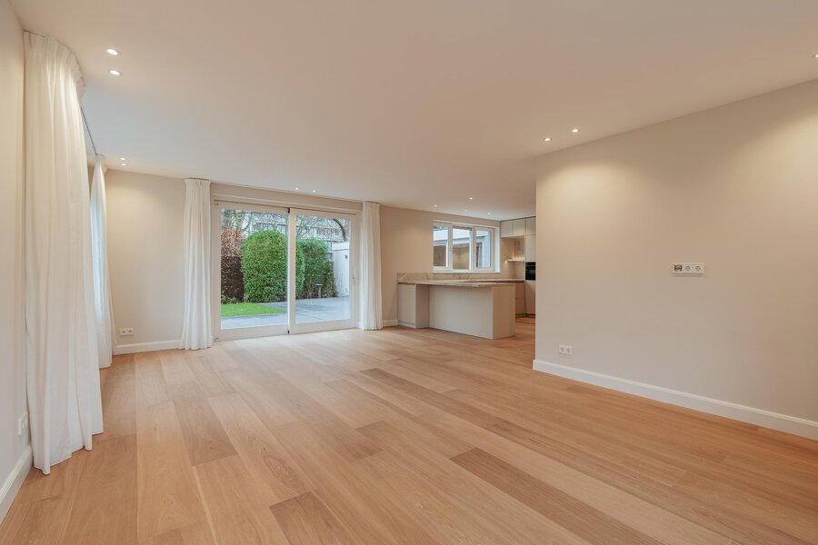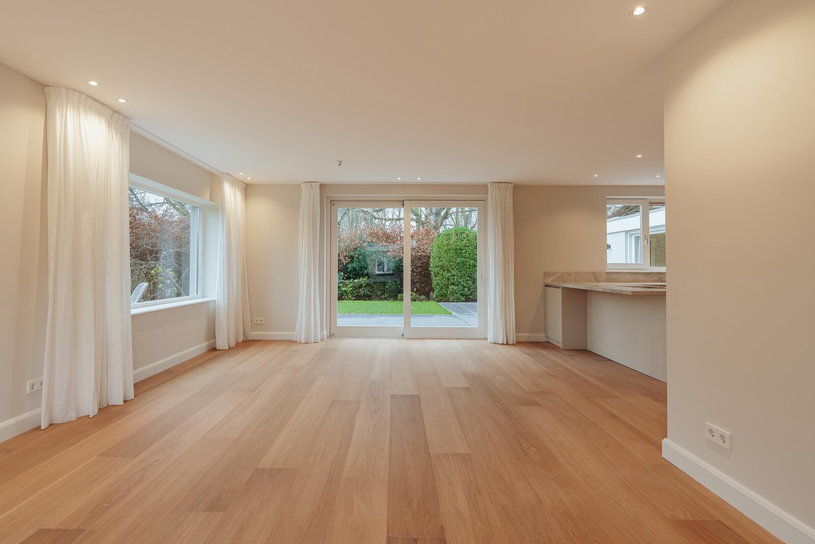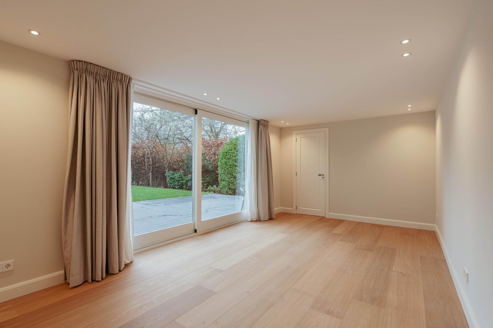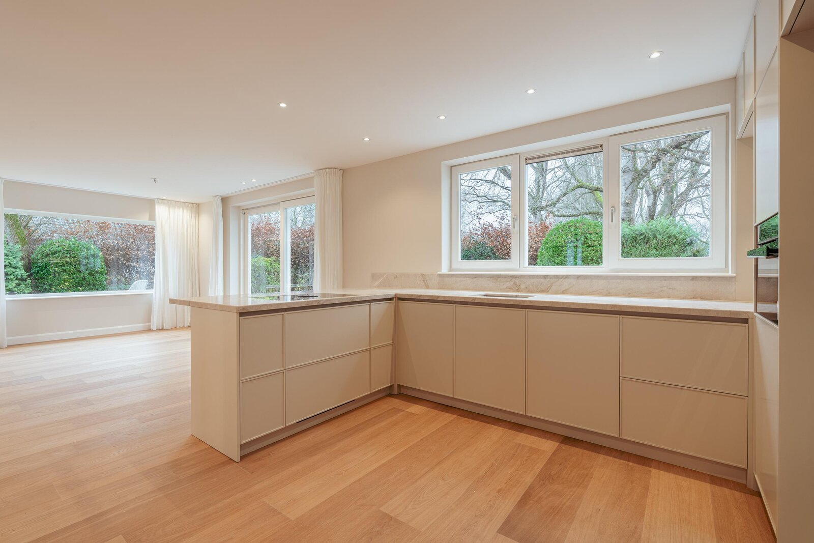 The generous living room is filled with natural light thanks to the large windows and offers a pleasant view of the garden. The open-plan living area is perfect for comfortable family living as well as entertaining guests. Adjacent is the luxury open kitchen with cooking island, designed in a sleek and timeless style and equipped with high-end built-in appliances, ample workspace and bespoke cabinetry.