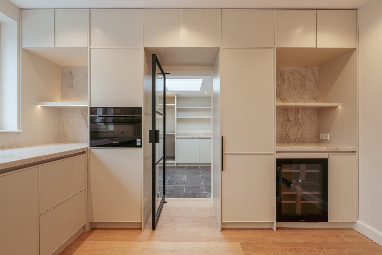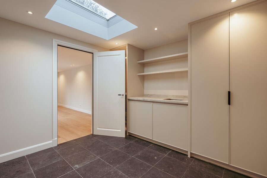 Daarnaast beschikt de begane grond over een praktische bijkeuken met extra bergruimte en aansluitingen voor wasapparatuur.