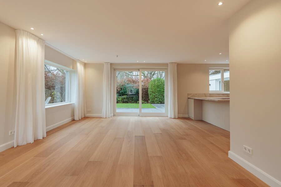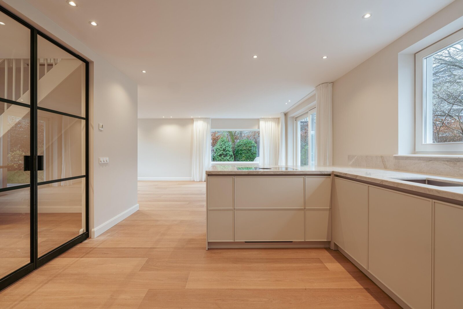 De royale woonkamer is aangenaam licht dankzij de grote raampartijen en biedt een prettig uitzicht op de tuin. De open leefruimte leent zich uitstekend voor zowel comfortabel dagelijks wonen als het ontvangen van gasten. Aansluitend bevindt zich de luxe open keuken met kookeiland, uitgevoerd in een strak en tijdloos design en voorzien van hoogwaardige inbouwapparatuur, veel werkruimte en op maat gemaakte kastruimte.