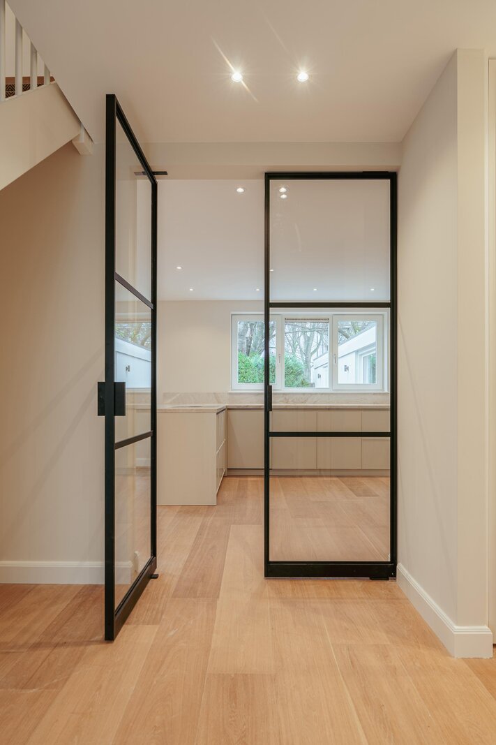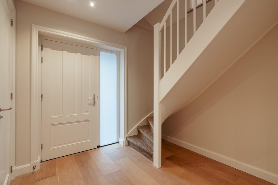 Via de verzorgde entree betreedt u de ruime hal met garderobe en een modern afgewerkt separaat toilet. Direct valt de hoogwaardige afwerking op, met strakke lijnen, rustige kleurstellingen en een warme houten vloer. De begane grond (evenals de eerste verdieping) is voorzien van comfortabele vloerverwarming.