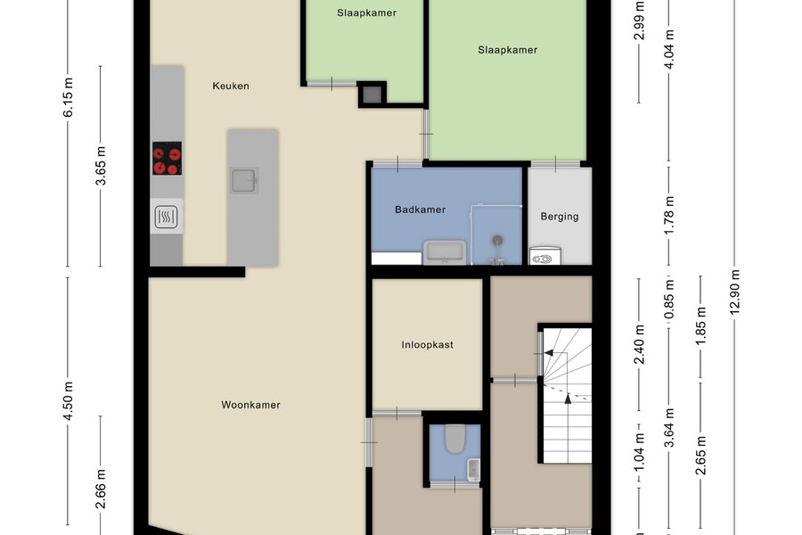 Hal met meterkast, toilet en eigen berging. Je komt het appartement binnen in de fijne lichte woonkamer met grote ramen en een halfopen keuken met eetgedeelte aan de achterzijde. De keuken is nieuw en voorzien van alle inbouwapparatuur, een spoeleiland met bar en genoeg werkruimte. Er is genoeg ruimte voor een eethoek en via de openslaande deuren loop je zo naar de tuin. Er zijn twee slaapkamers en een nette badkamer voorzien van inloopdouche met rainshower, een wastafel met spiegel en een tweede toilet. Verwarmen en koelen kan via de airco’s. Er is een separate waskamer met aansluitingen voor de wasmachine en wasdroger.