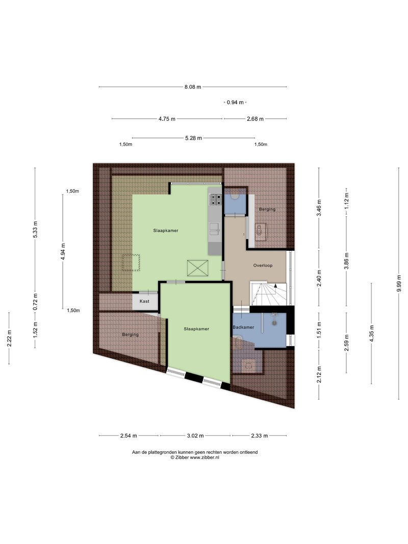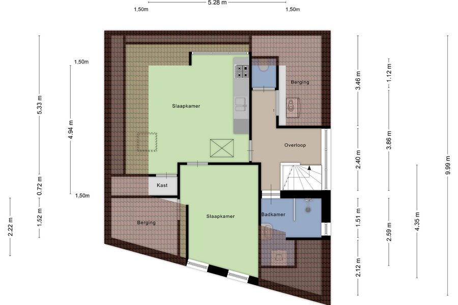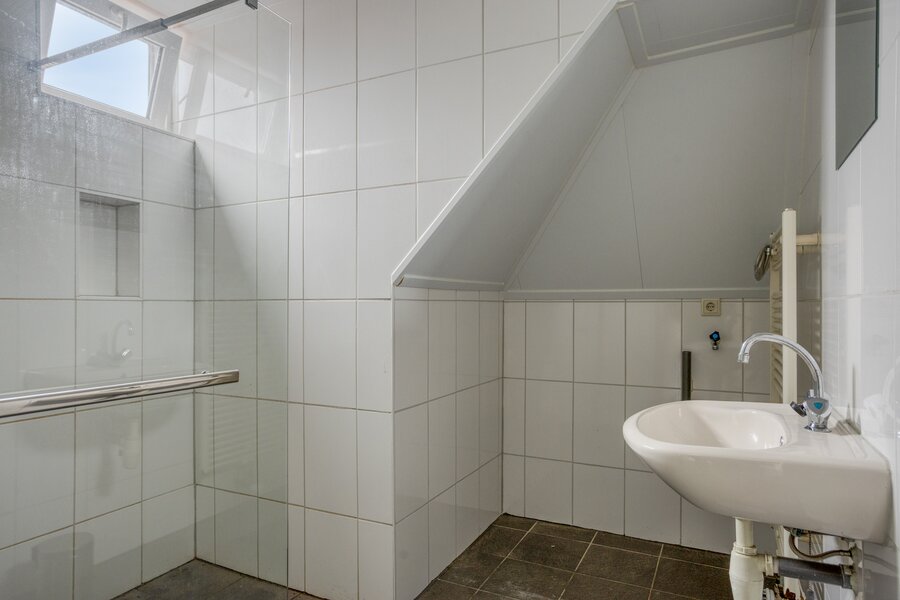 Ook deze zolderverdieping is verrassend ruim; voorzien van een overloop met toegang tot de bergruimte, een nette badkamer en een separaat toilet. Op deze verdieping is genoeg ruimte voor twee slaapkamers, of zoals nu ingericht; een studio met keuken en een aparte slaapkamer.