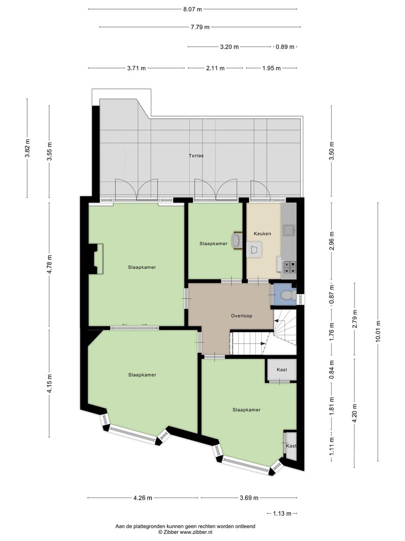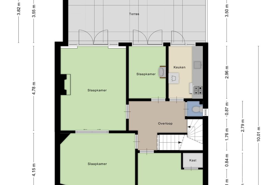 Via de trap kom je bij de unieke bovenwoning, met een grote kamer-en-suite (perfect voor een extra woonkamer, werkkamer of slaapkamers), nog twee slaapkamers en een aparte keuken. Zowel vanuit de kamer-en-suite, als uit de slaapkamer en keuken, kan je naar het dakterras. Op de overloop is een apart toilet aanwezig.
