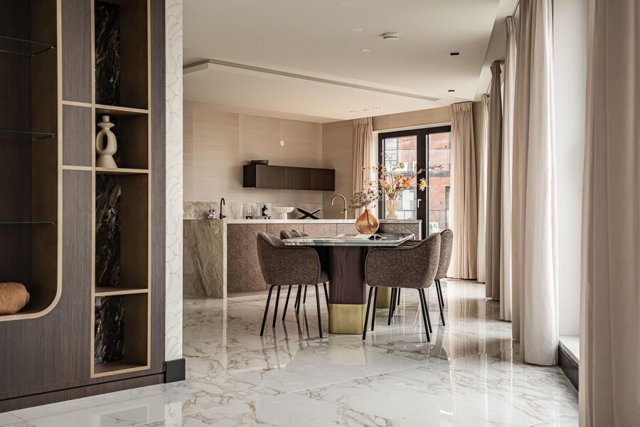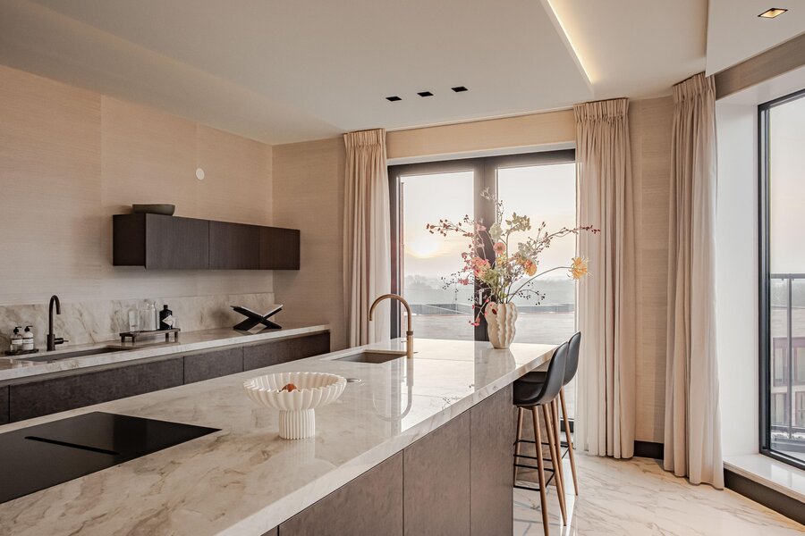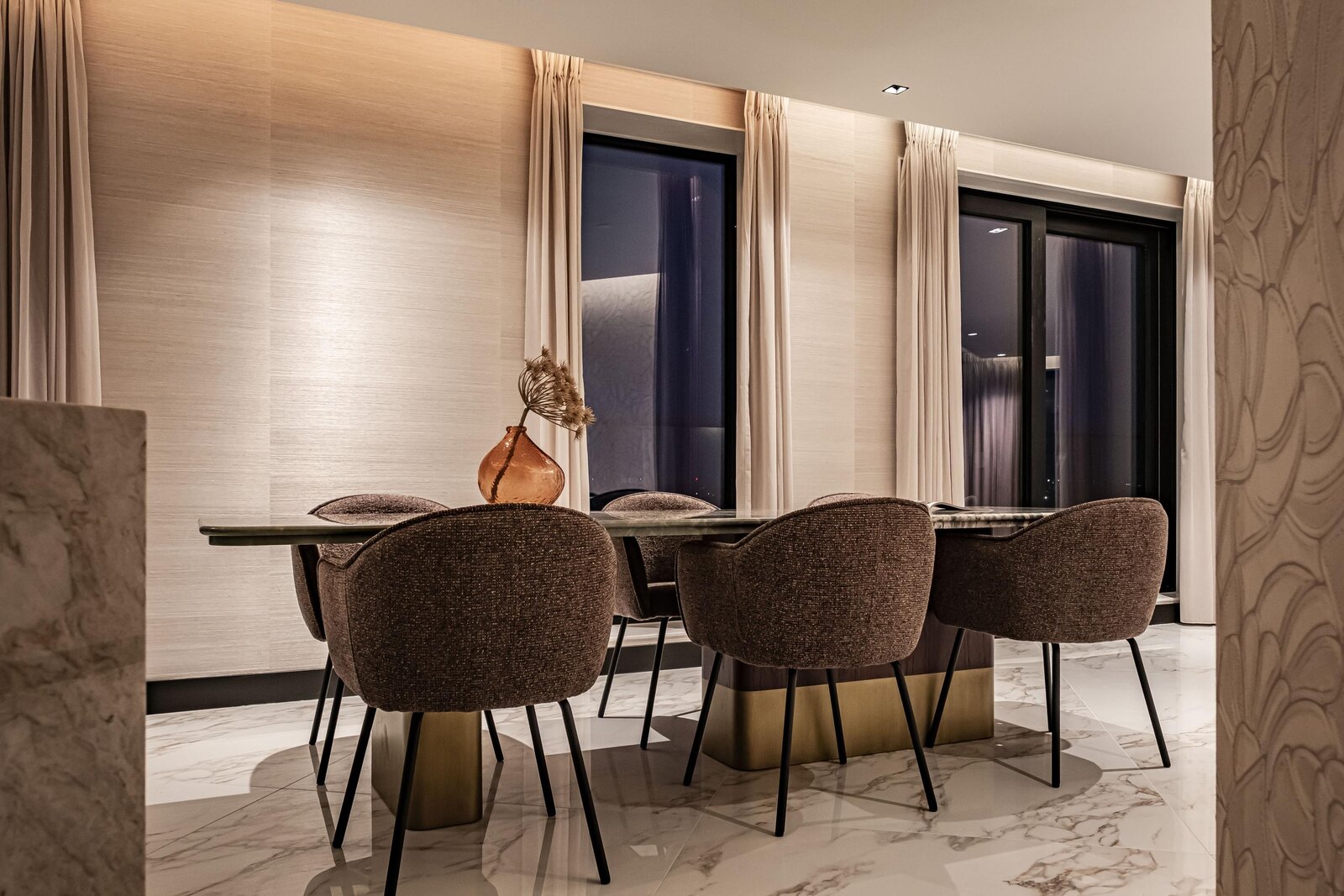 De moderne luxe keuken met marmeren blad is uitgerust met diverse hoogwaardige inbouwapparatuur (o.a. dubbele vaatwasmachine) en is van alle gemakken voorzien. De woonkeuken met fraaie eettafel (eveneens voorzien van marmeren blad) biedt voldoende ruimte om te dineren met grote gezelschappen, in stijl, met het schitterende uitzicht.