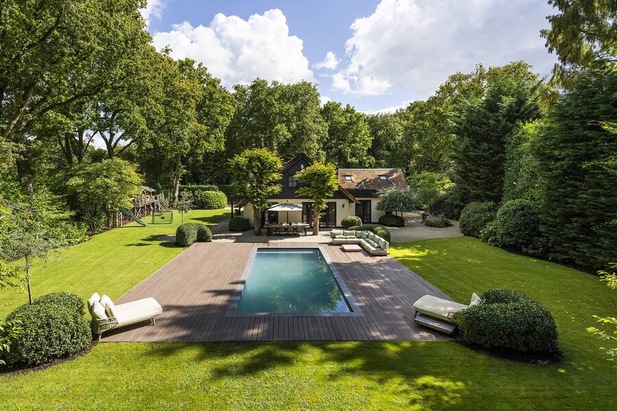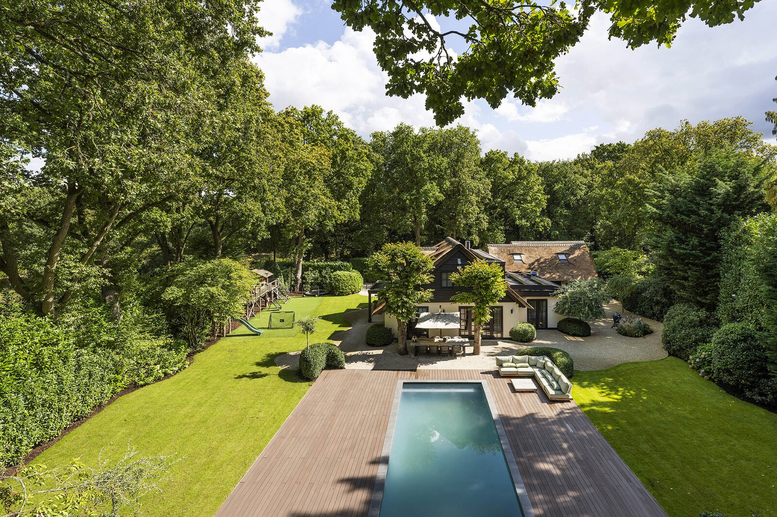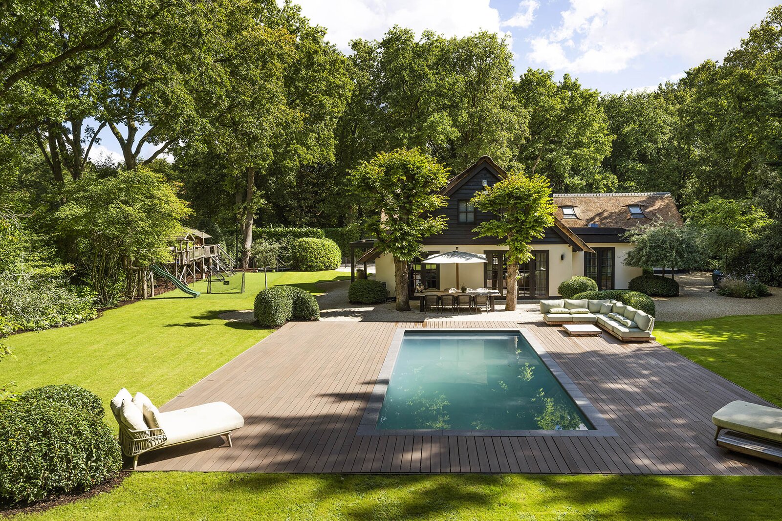 Wie de tuin inloopt, staat in een privéresort. Hier liggen zonneterrassen rondom een verwarmd magnesiumzwembad. Een onderhoudsarme, stijlvolle vlonder omsluit het water. De tuin is onder architectuur ontworpen en volledig computergestuurd beregend vanuit eigen bron. Voor kinderen is er een natuurlijk speelveld met klimnetten en hutten: avonturen in de natuur zonder het erf te verlaten.