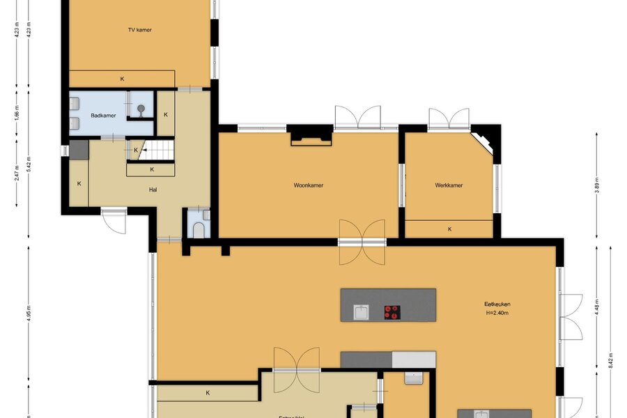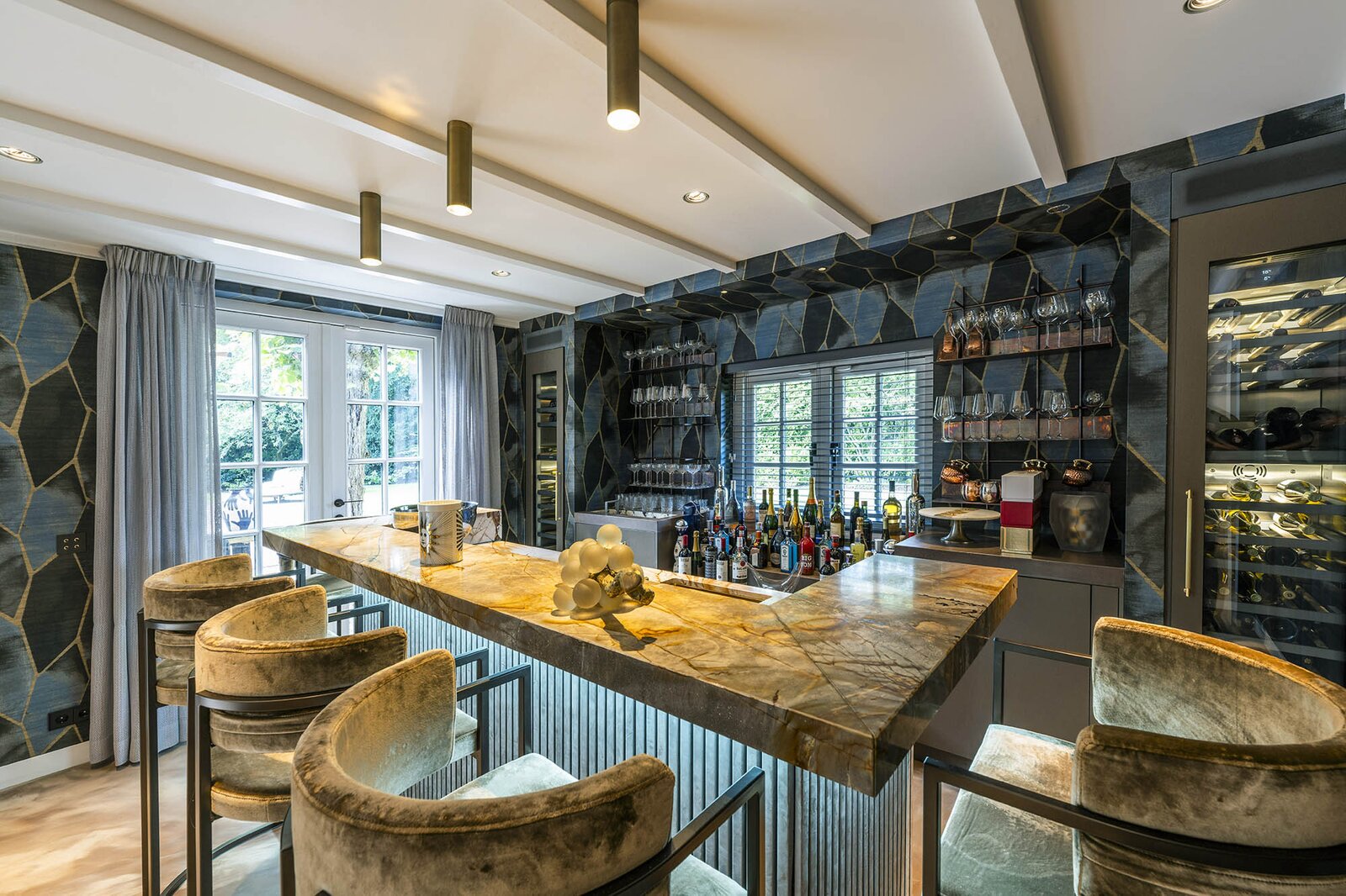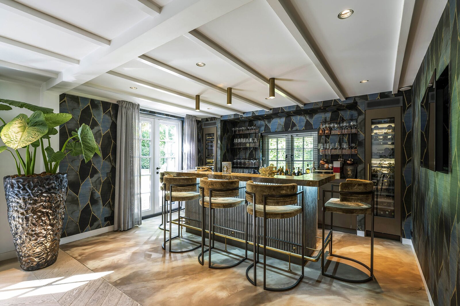 Bij binnenkomst wordt meteen duidelijk dat deze villa gebouwd is vanuit een visie op woongenot. De hal met leren trapbekleding en zichtlijnen naar meerdere leefruimten vormt de luxe entree van een uitzonderlijk huis. Via elegante taatsdeuren betreedt u de riante woonkeuken, het sociale hart van de woning. Het kookeiland is uitgevoerd in marmer met een leerfinish, omringd door topklasse Gaggenau-apparatuur en een volledig ingerichte bar met wijnklimaatkasten. Koken, borrelen, genieten – het gebeurt allemaal hier.