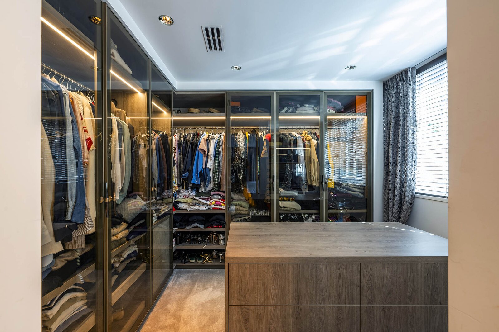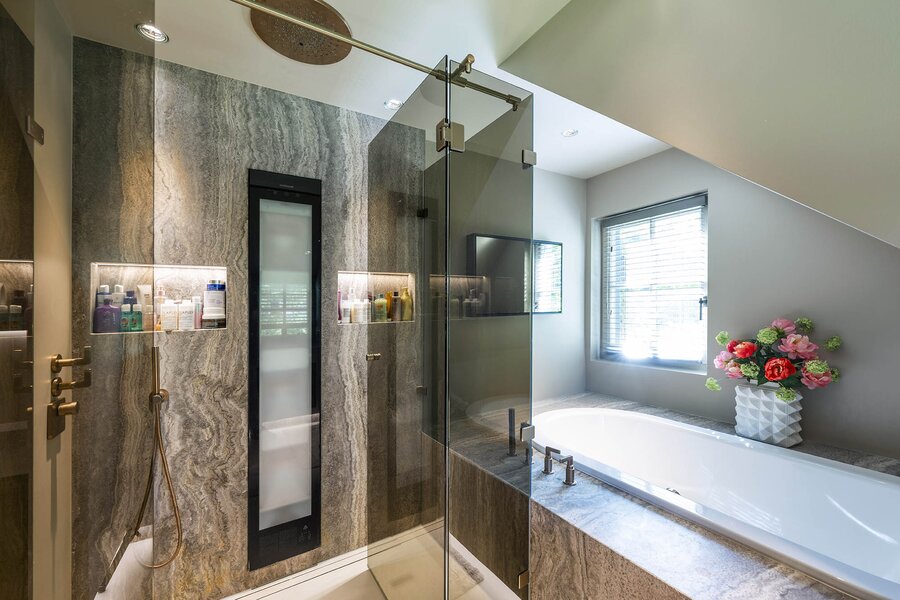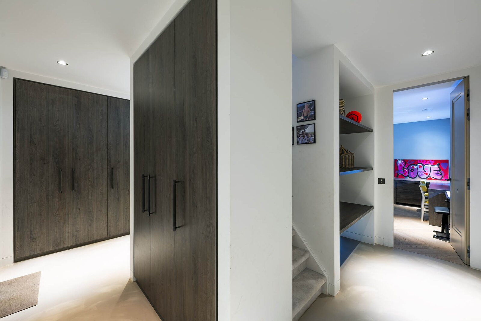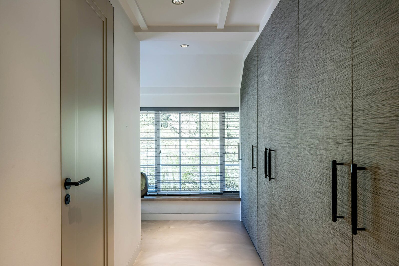 De eerste verdieping is ontworpen als privéverblijf, met rust en ruimte als uitgangspunt. De master suite strekt zich uit over drie kamers: een serene slaapkamer, een riante dressing (desgewenst eenvoudig te wijzigen in extra slaapkamer) en een luxueuze badkamer voorzien van marmer, maatwerkmeubilair en Gessi-sanitair.