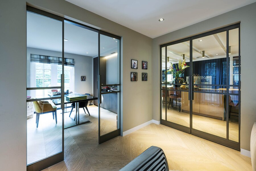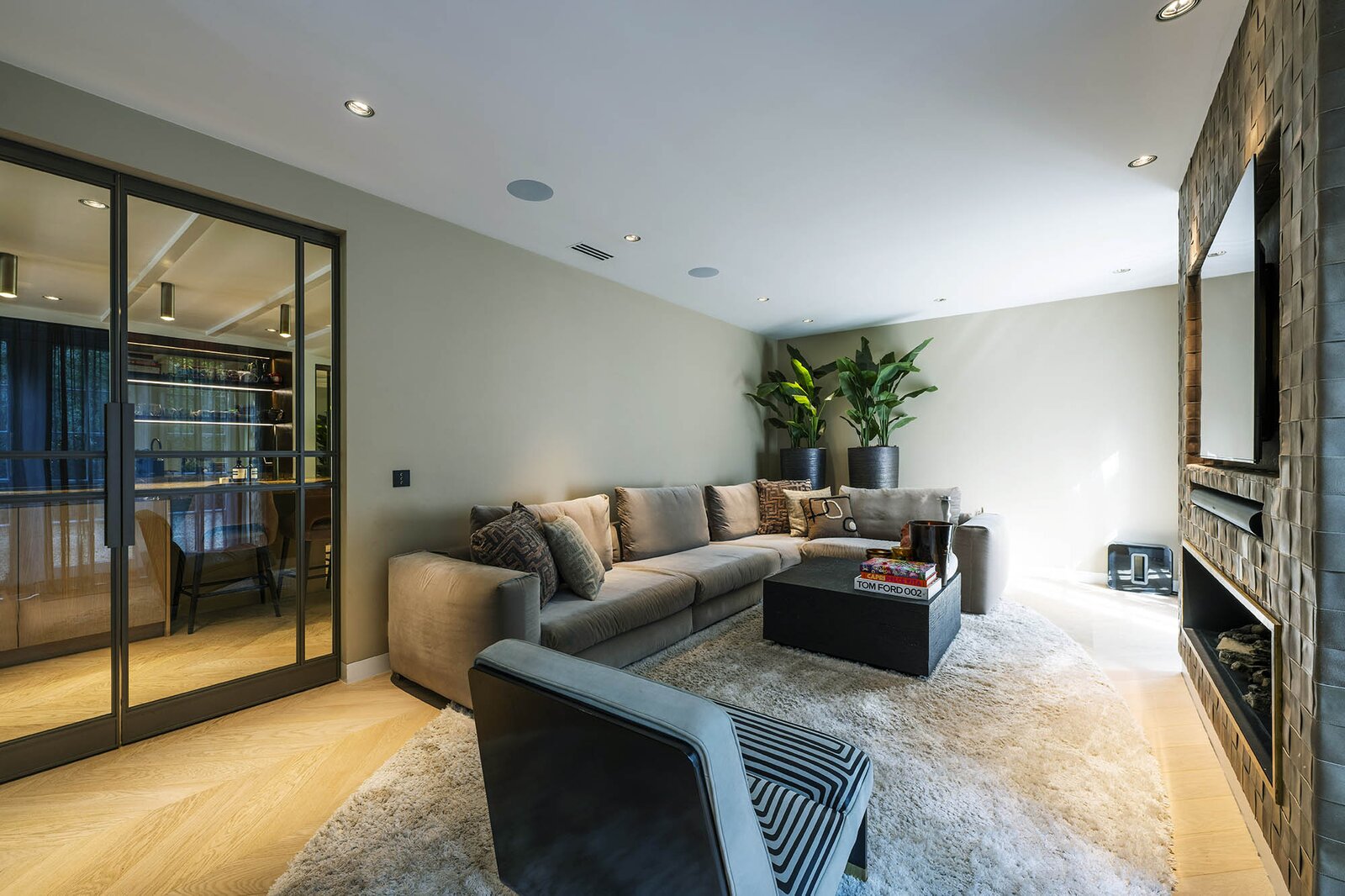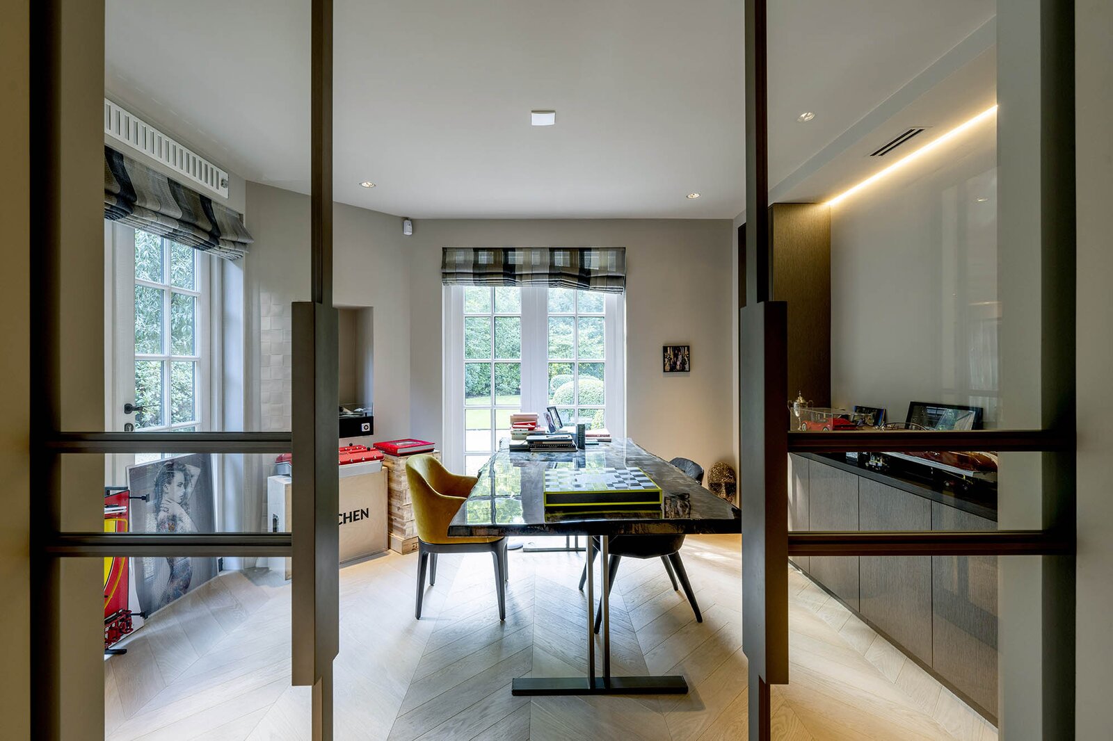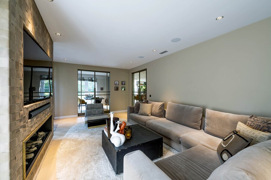 De aangrenzende woonkamer is ruim, warm en stijlvol, met een met de hand gevlochten leren wand, een bio-ethanolhaard en een adembenemend uitzicht op de natuur. Daarnaast biedt de begane grond een werkkamer en een multifunctionele vleugel. Deze vleugel beschikt over een eigen entree, badkamer, tv-/loungeruimte met Dolby Digital bioscoopsysteem en zelfs een ‘eigen voordeur’. Perfect voor logees, tieners, au-pair, of gelijkvloers wonen.