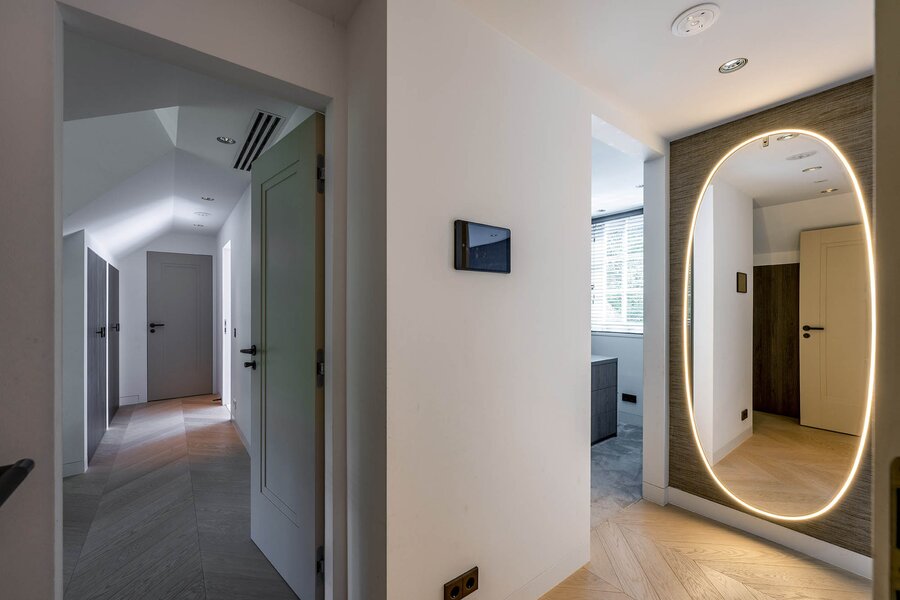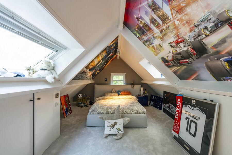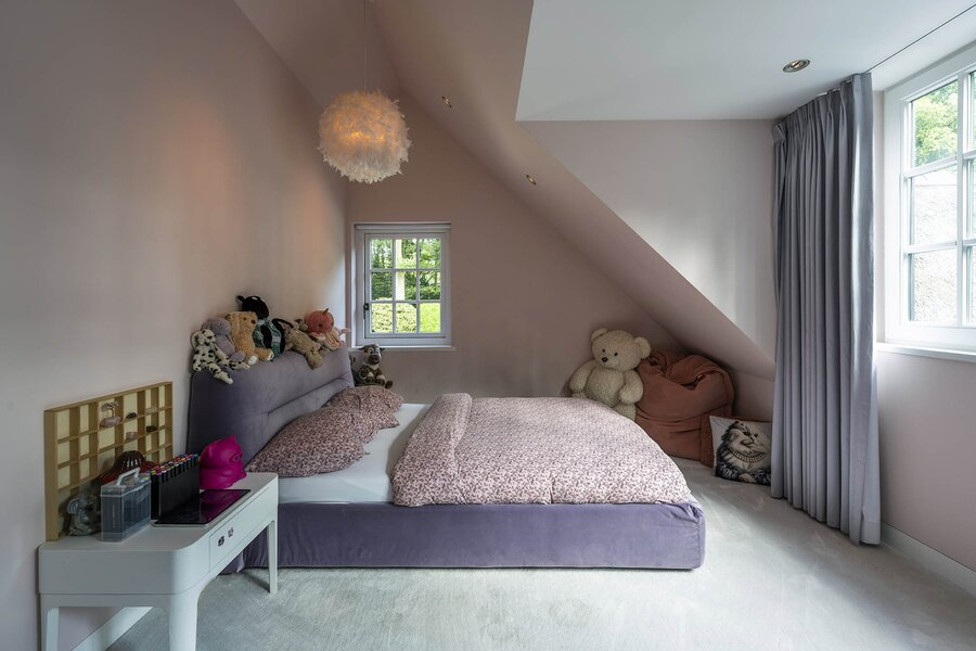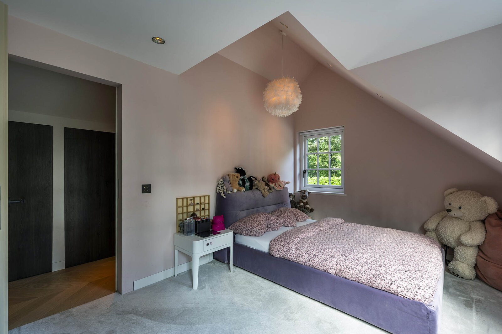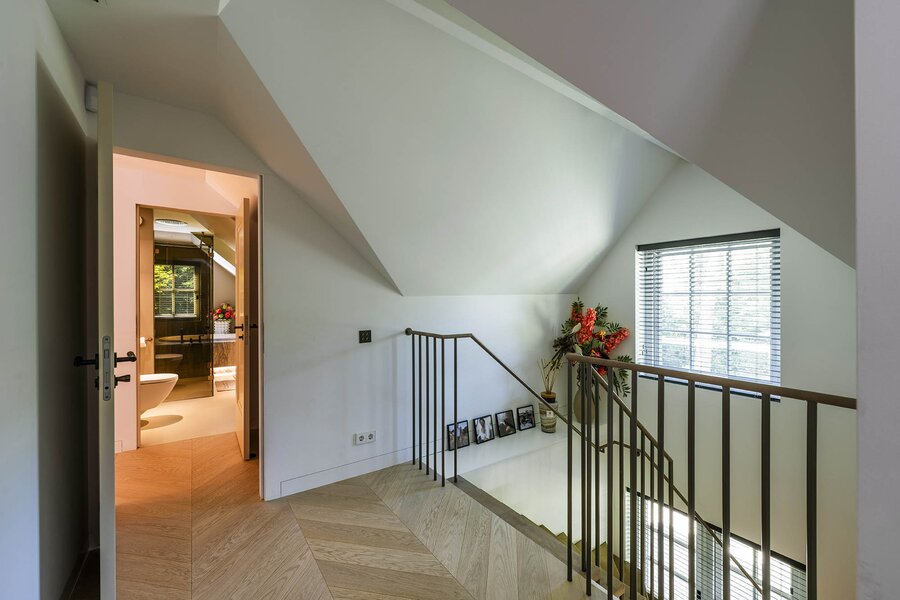 De overige twee slaapkamers delen dezelfde verfijning en beschikken over een eigen luxe badkamer. De overloop met vide benadrukt opnieuw het luchtige, open karakter van dit huis. Alles klopt, alles ademt kwaliteit en comfort.