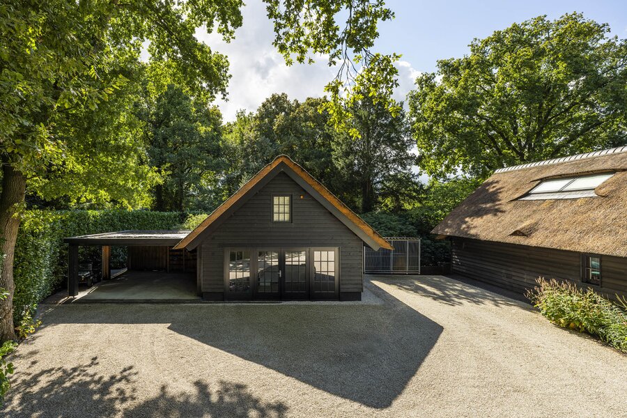 Middels de automatische toegangspoort wordt de zeer ruime oprit met parkeergelegenheid voor meerdere auto's bereikt, met aan de linkerzijde een riant vrijstaand rietgedekt questhouse met aangrenzend een carport voor twee auto's en aan de