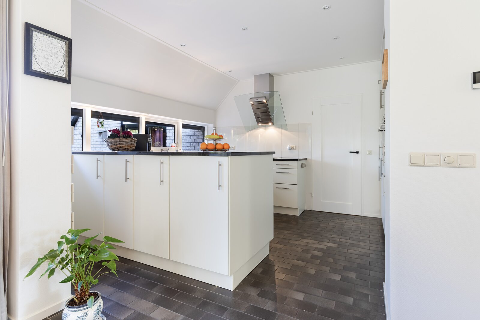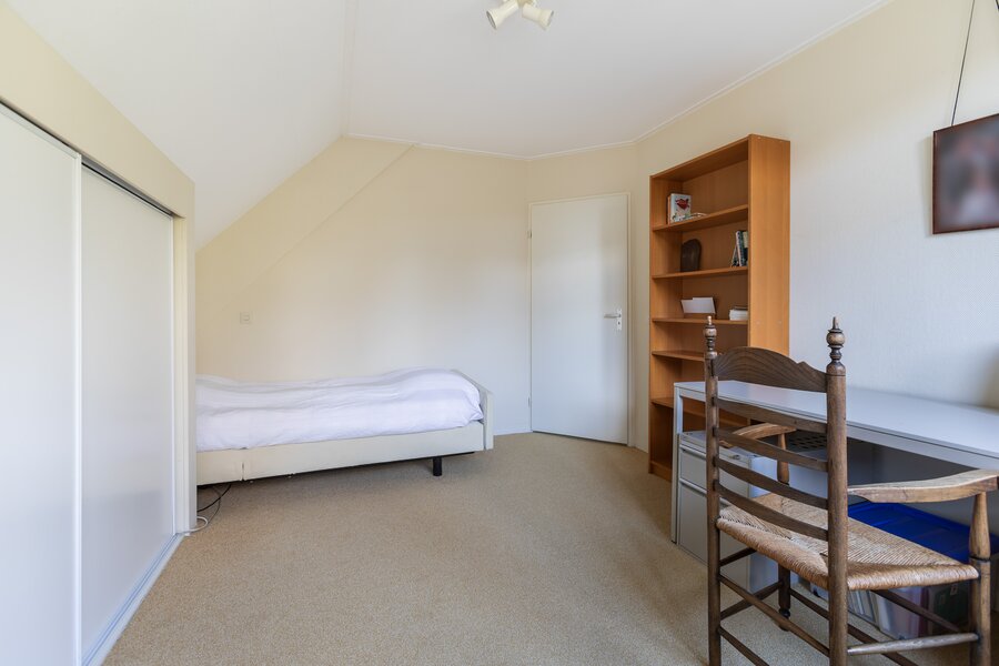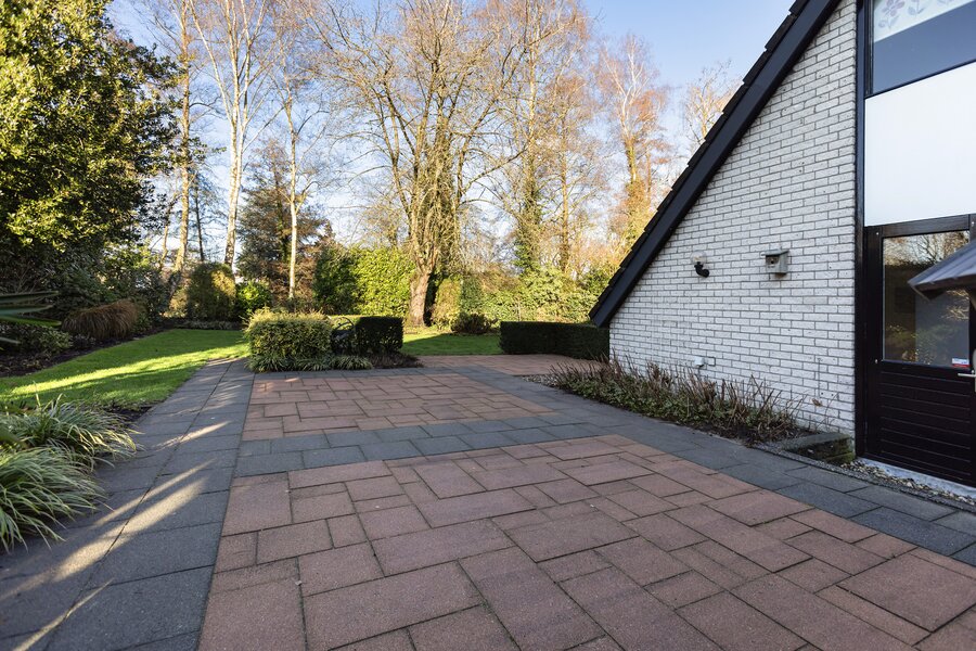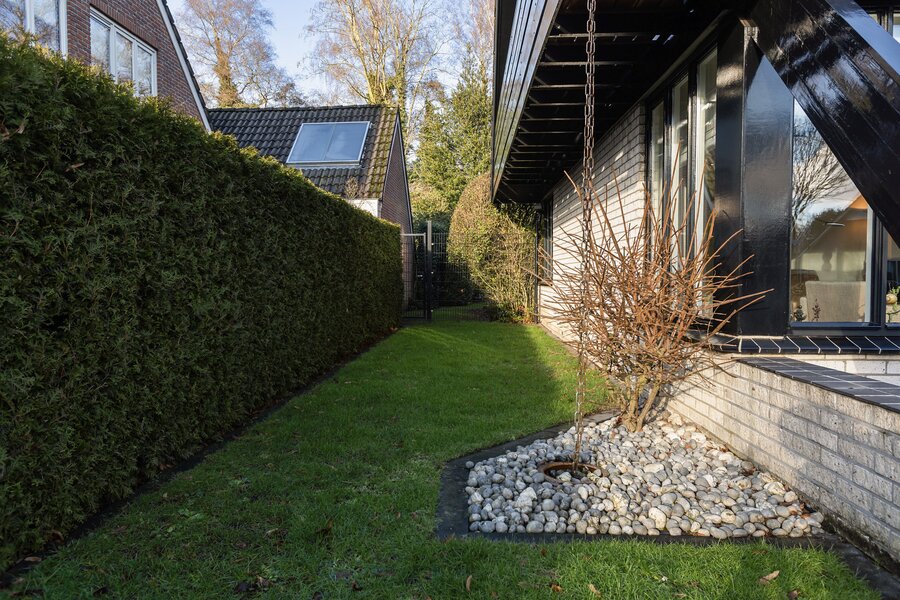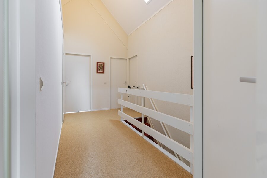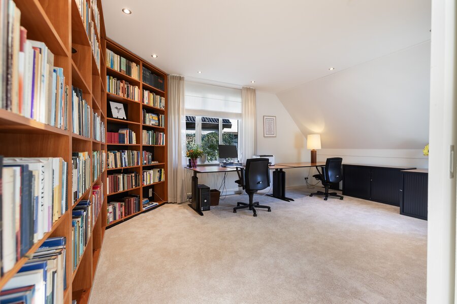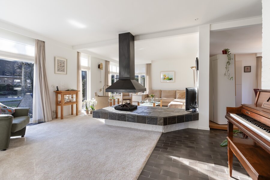 U betreedt de woning via een representatieve hal met garderobe en een modern toilet. Vanuit hier heeft u toegang tot de master bedroom op de begane grond, compleet met vaste kastenwand en een lichte en-suite badkamer. De praktische bijkeuken met wasruimte biedt doorgang naar de aangebouwde in spouw gebouwde garage, die verrast met een grote zolder op stahoogte, bereikbaar via een vaste trap. Het hart van het huis is de prachtige living met een sfeervolle centrale haard. Aan de voorzijde vindt u een separate speel- of werkkamer, terwijl de tuingerichte woonkeuken met diverse inbouwapparatuur en een schuifpui uitnodigt tot lange avonden tafelen.