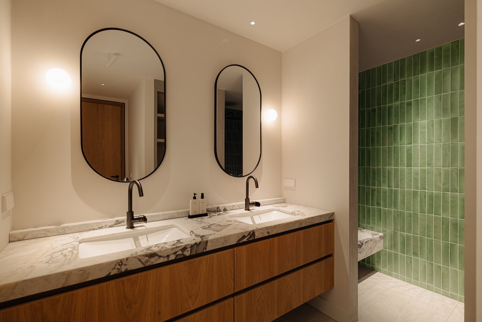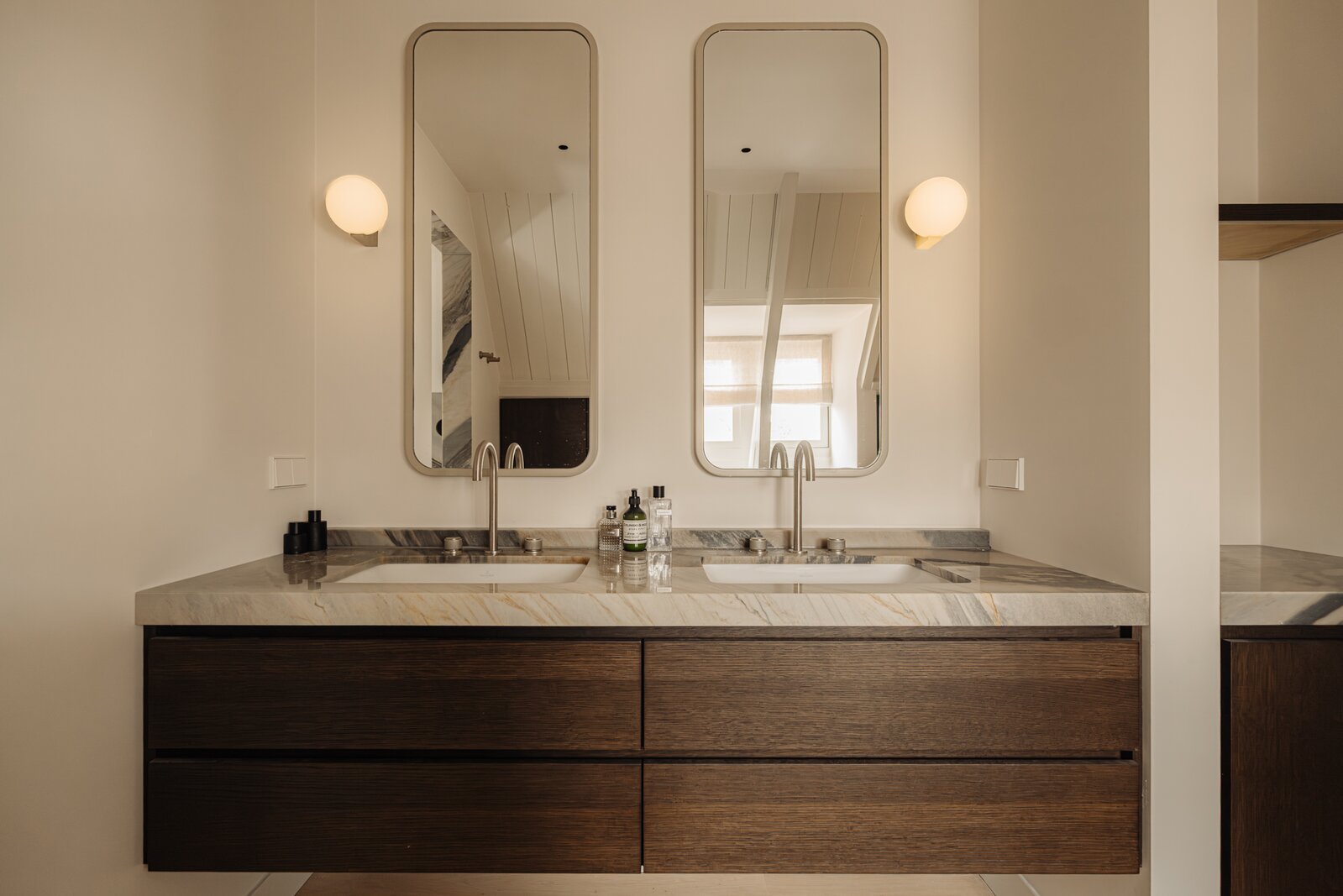 Centraal op deze verdieping bevindt zich de luxueuze badkamer, voorzien van een ruime inloopdouche en een bijzonder breed wastafelmeubel met natuurstenen blad, houten lades en dubbele wastafel. Daarnaast is er een separate, royale wasruimte met vaste kasten, wastafel en aansluitingen voor wasmachine en droger. Tevens bevindt zich op deze verdieping een luxe, separaat, Japans toilet.