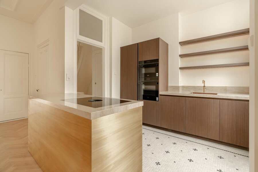De recent vernieuwde, luxe open keuken is voorzien van hoogwaardige inbouwapparatuur, een kookeiland en een strak design.