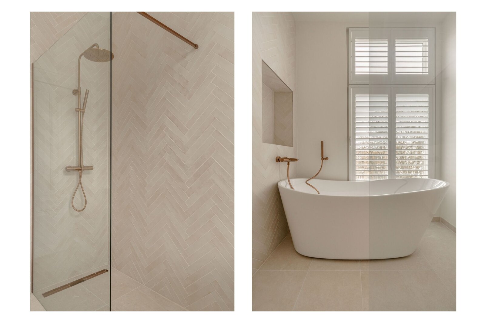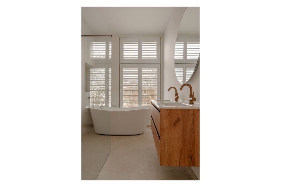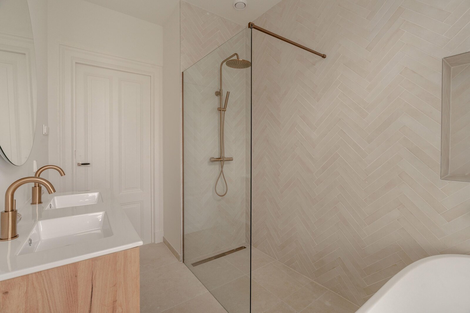 De luxe badkamer is recent vernieuwd en voorzien van een ligbad, inloopdouche, dubbele wastafel en toilet.