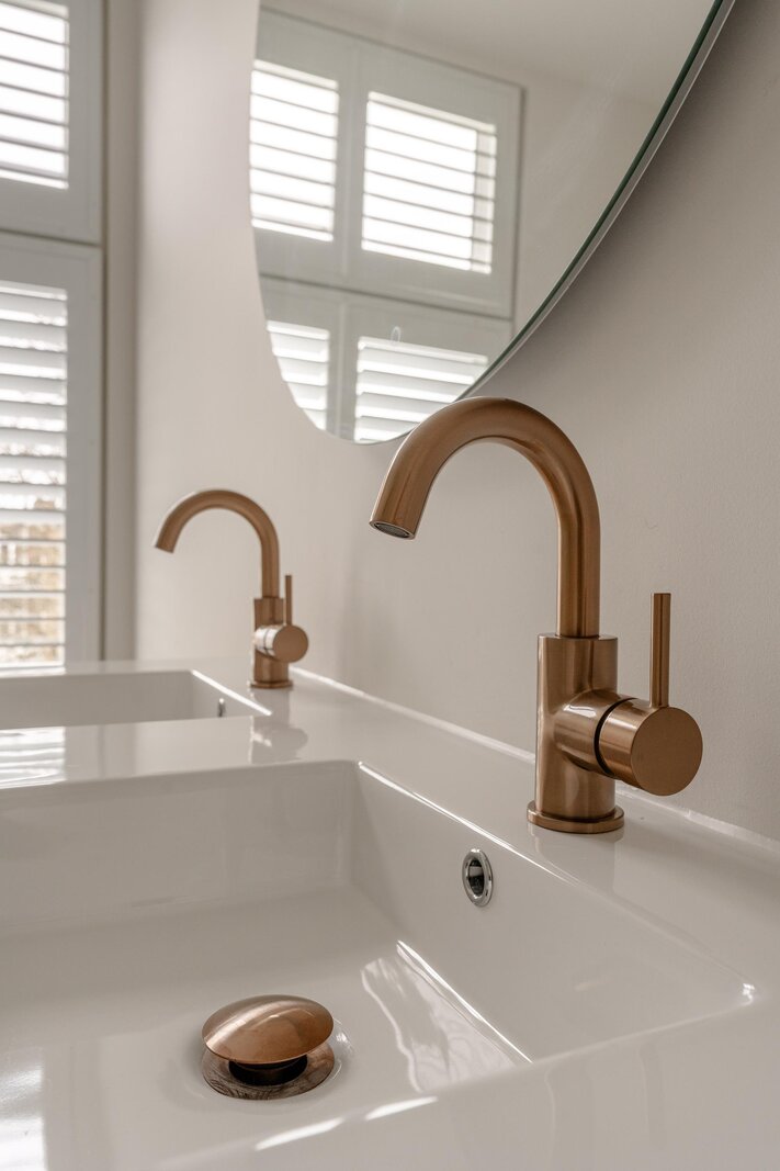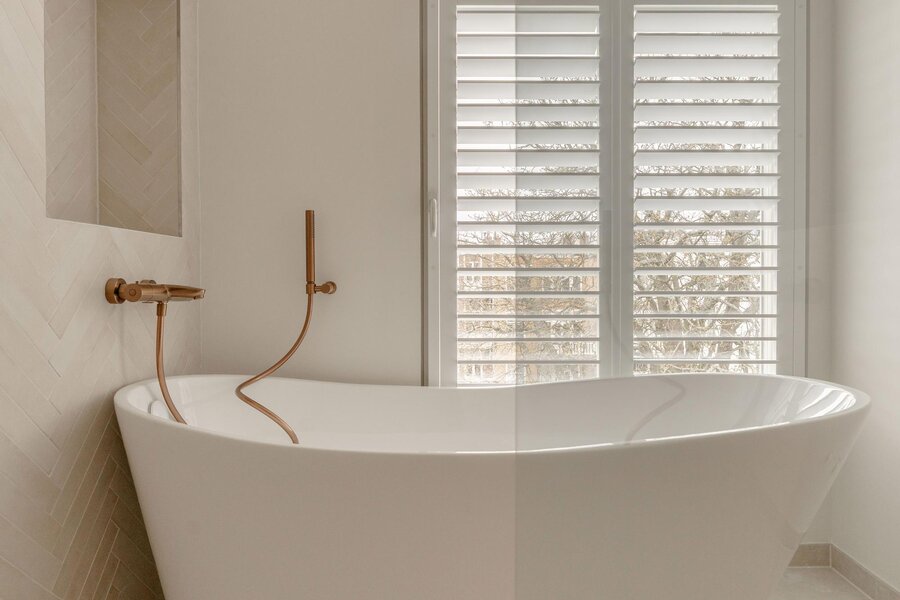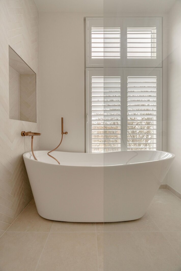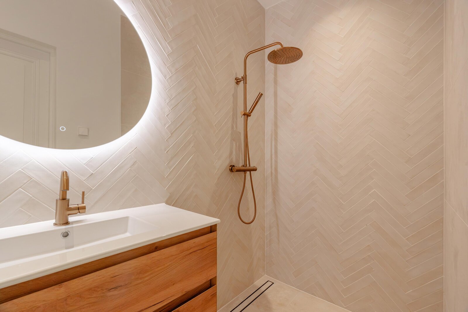 De luxe badkamer is recent vernieuwd en voorzien van een ligbad, inloopdouche, dubbele wastafel en toilet.