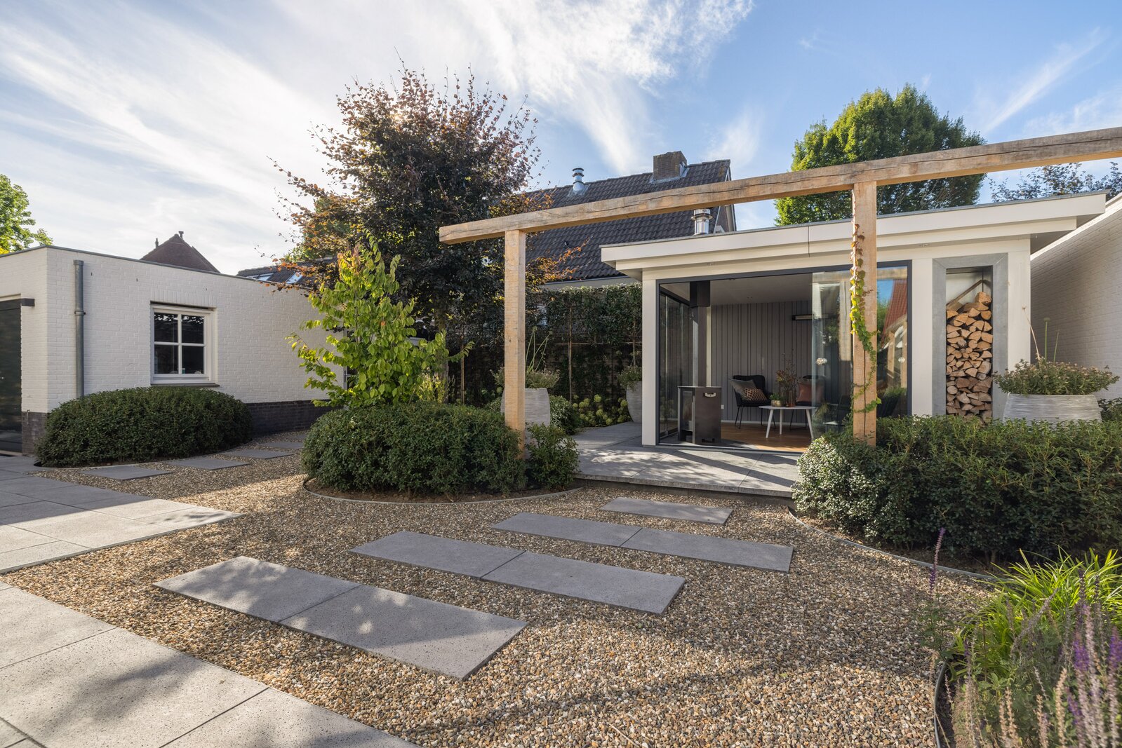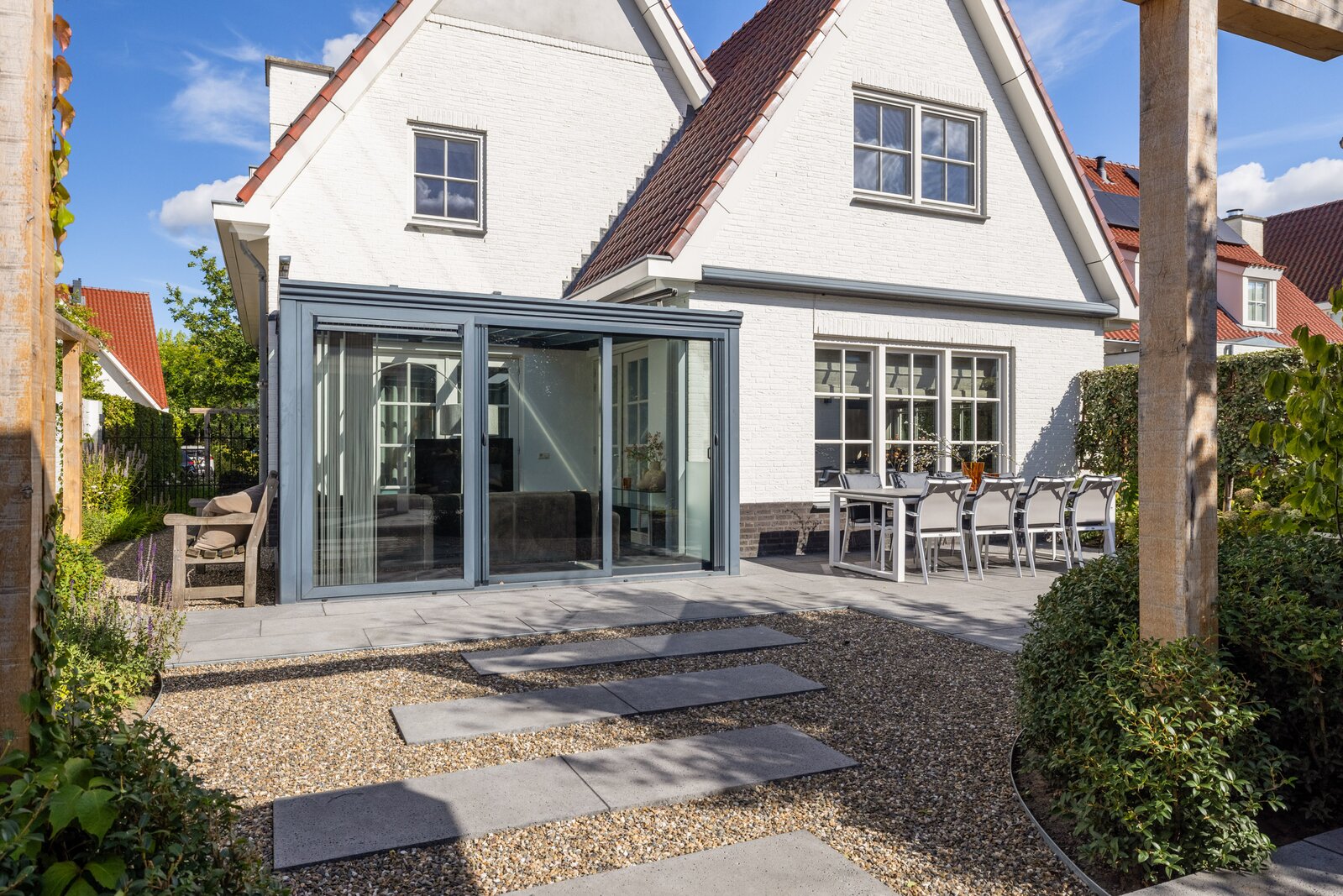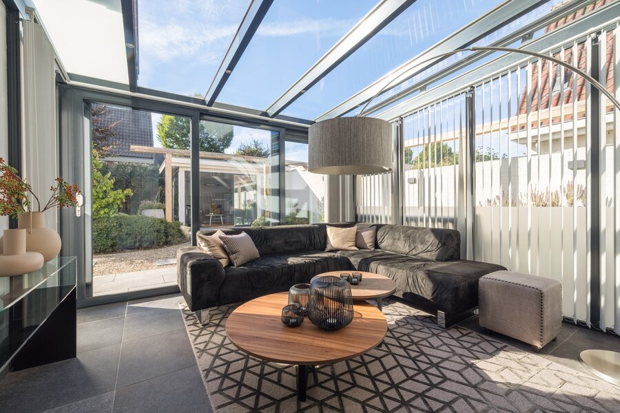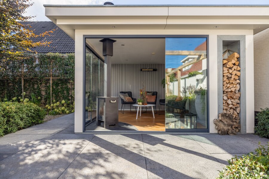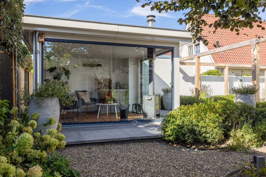 Een tuinkamer grenzend aan woonkamer en keuken, gecombineerd met een omsloten overkapping in de zonnige achtertuin, creëren meerdere plekken om het hele jaar door buiten te leven.