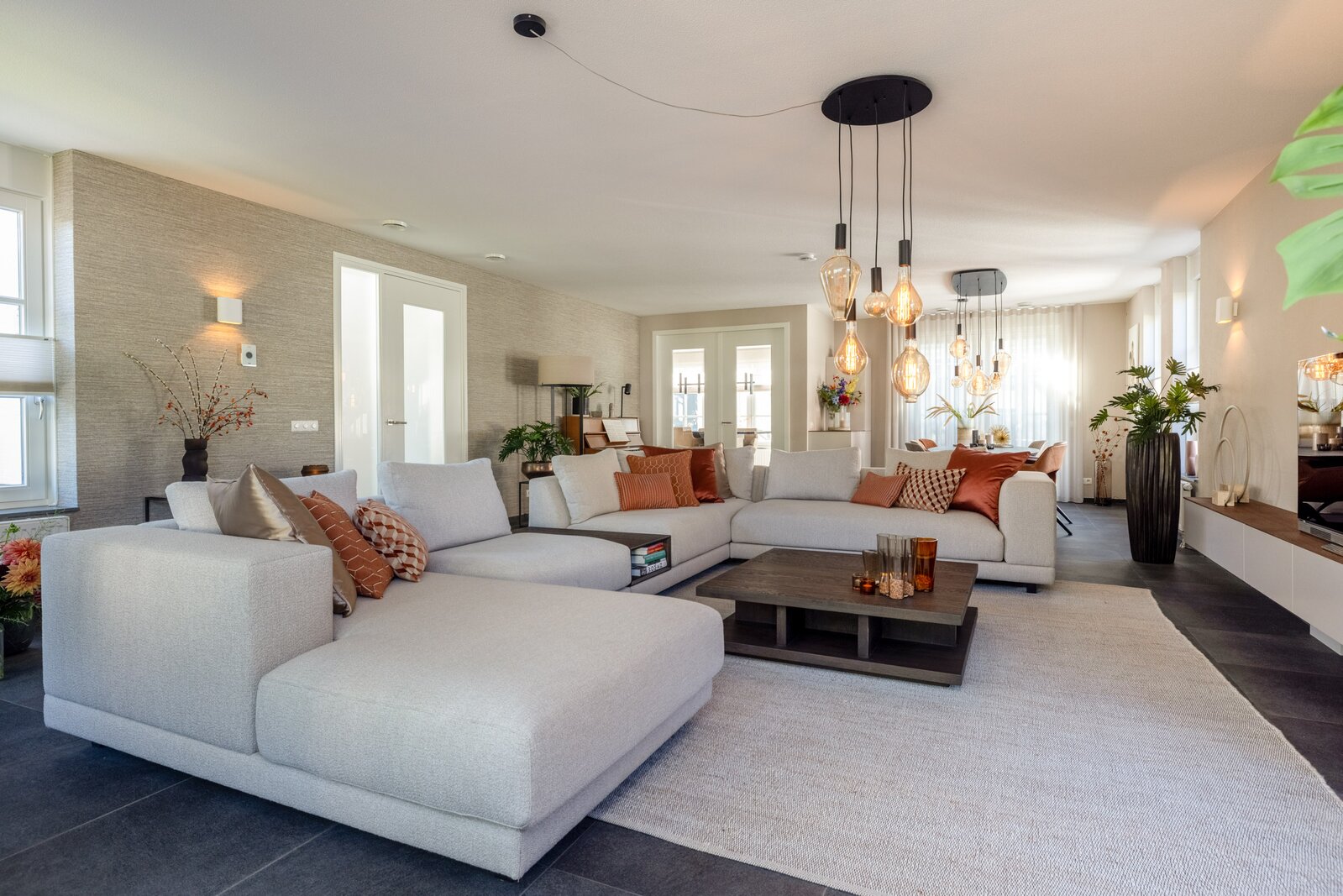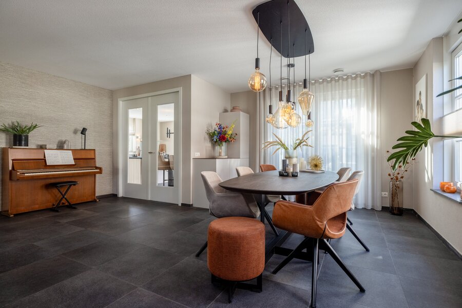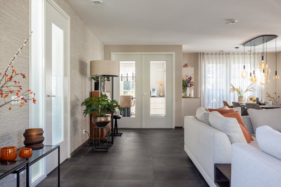 De woonkamer geniet van daglicht aan drie zijden en combineert een zit- en eetgedeelte met een stijlvolle natuurstenen vloer en zachte, lichte tinten. Aansluitend bevindt zich de tuinkamer (2010): een transparante leefruimte met glazen wanden en dak, voorzien van elektrisch bedienbare screens en schuifdeuren naar de tuin – perfect als rustige leesplek of extra lounge.