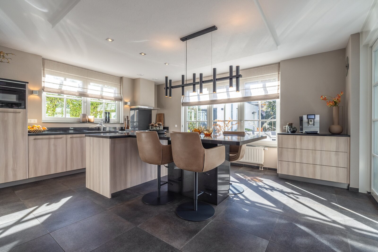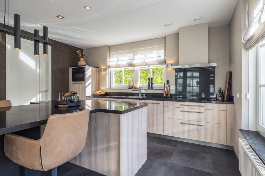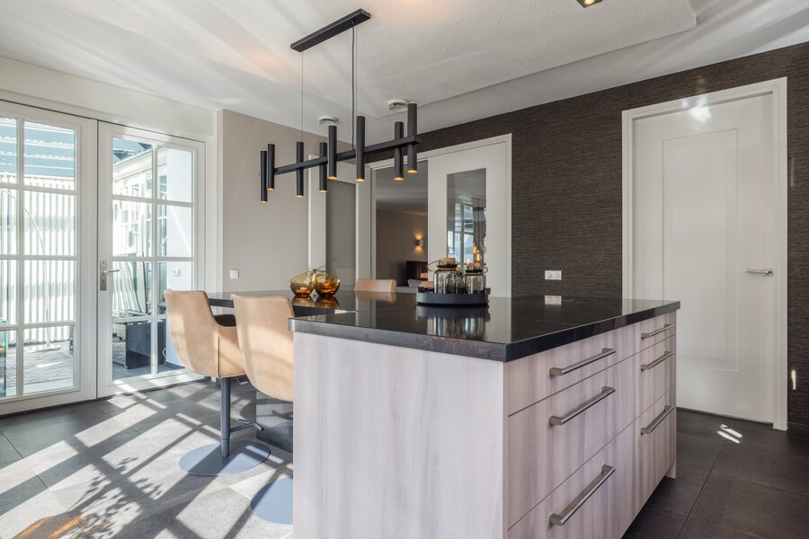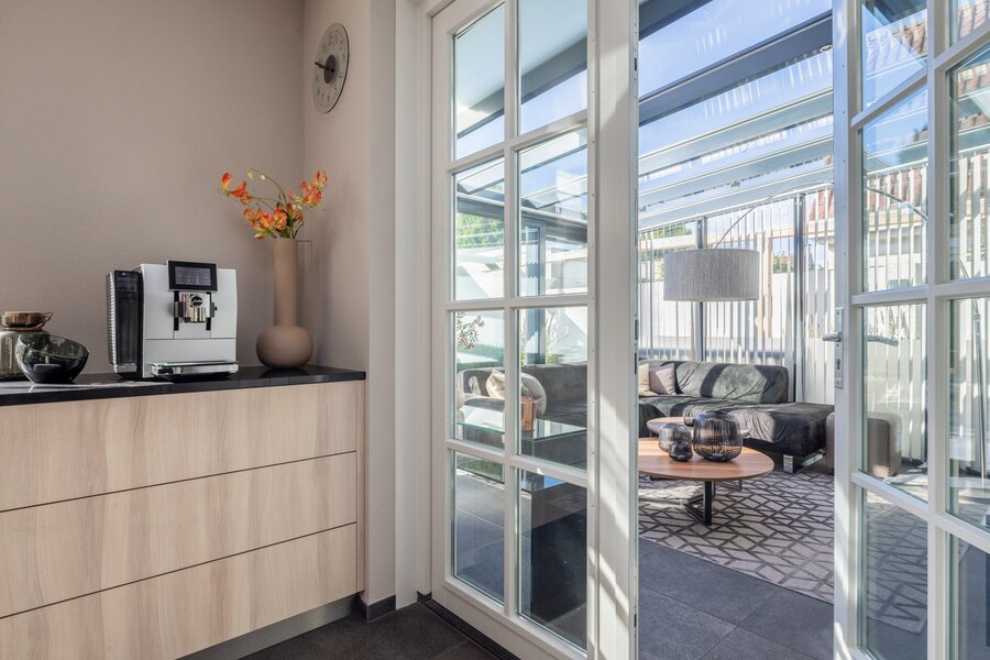 De royale leefkeuken vormt het hart van het huis, met centraal kookeiland, eetgedeelte en een speciaal ingerichte koffiehoek. Een plek waar koken, samenzijn en dagelijks leven moeiteloos samenkomen. Aangrenzend ligt de praktische bijkeuken met interieur maatwerkkasten, opstelling voor wasapparatuur en extra bergruimte.