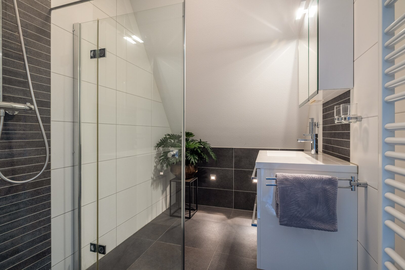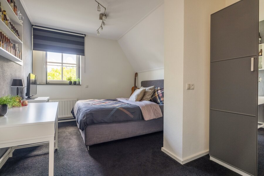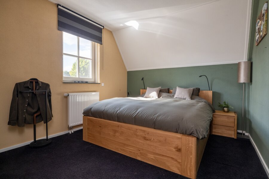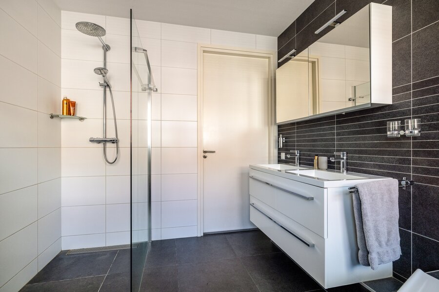 Op de verdieping bevinden zich vier slaapkamers en twee badkamers. De hoofdslaapkamer beschikt over een eigen badkamer met inloopdouche en modern wastafelmeubel. De overige slaapkamers delen een complete tweede badkamer met ligbad, inloopdouche, dubbele wastafel en derde toilet. Alles is keurig onderhouden en tijdloos uitgevoerd.