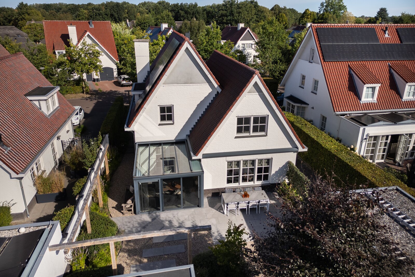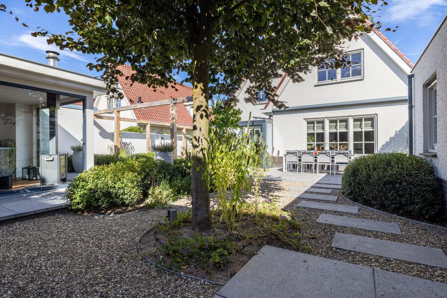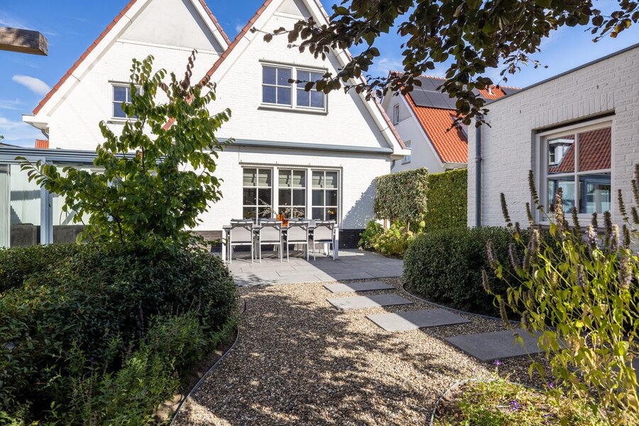 De achtertuin is fraai aangelegd, groen en onderhoudsvriendelijk, met meerdere terrassen en een lange tuintafel voor zomerse diners. Een brede, uitschuifbare luifel biedt schaduw op warme dagen.