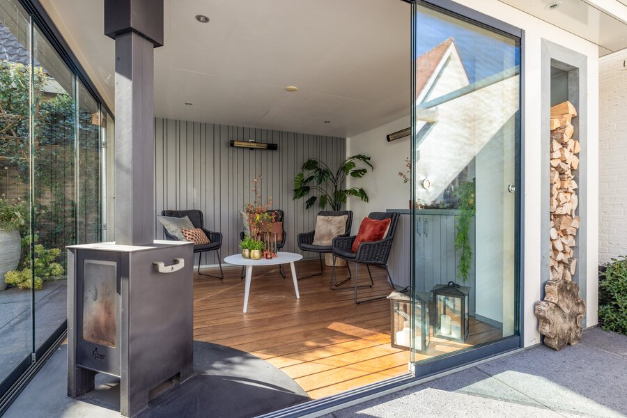 In de hoek van de tuin bevindt zich een omsloten overkapping (2019) met houtgestookte kachel, houten vloer, warmtelampen en glazen schuifwanden rondom. Een intieme buitenkamer waar je vrijwel het hele jaar door beschut kunt genieten. Afsluitbare hekken aan beide zijden zorgen voor privacy en veiligheid.