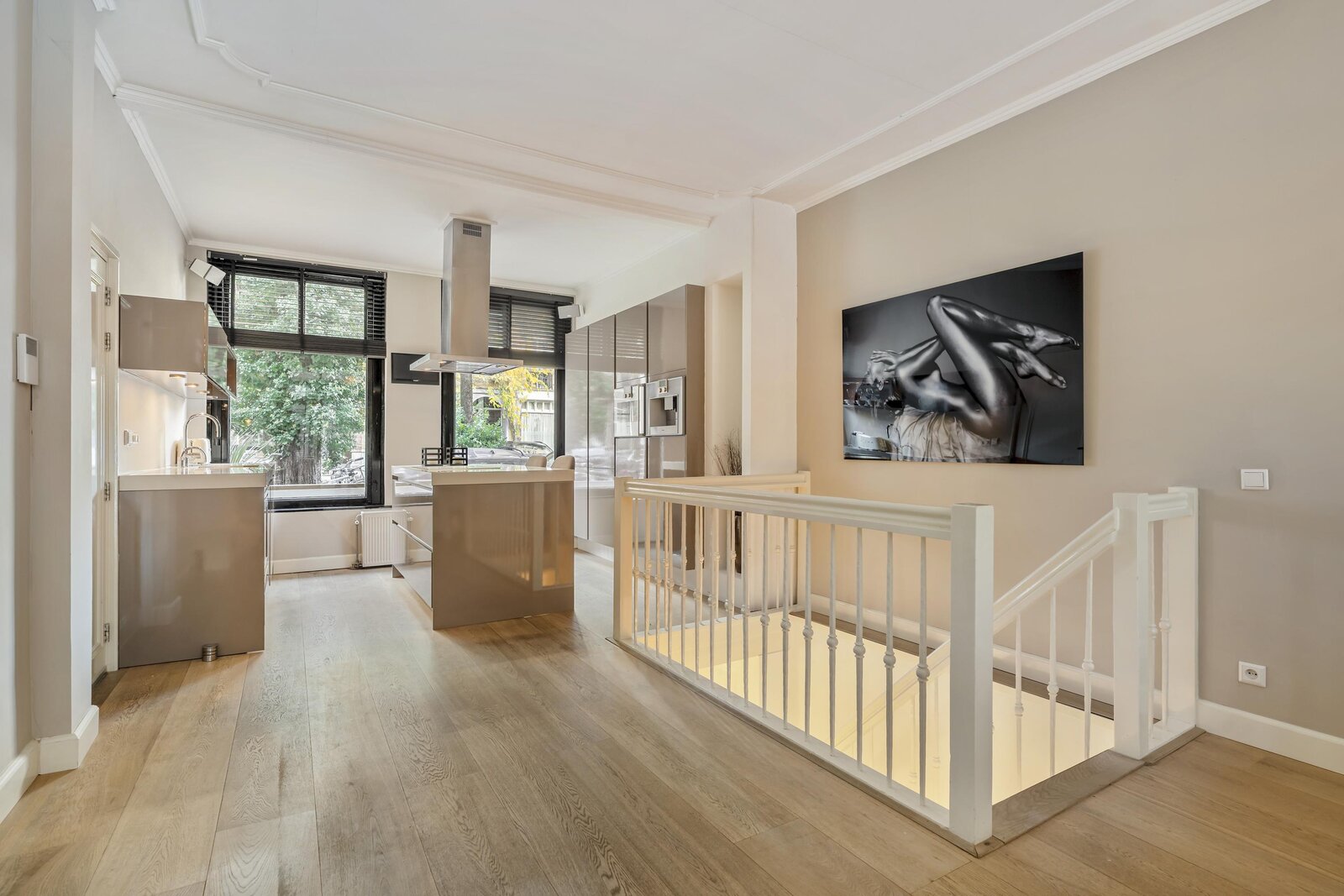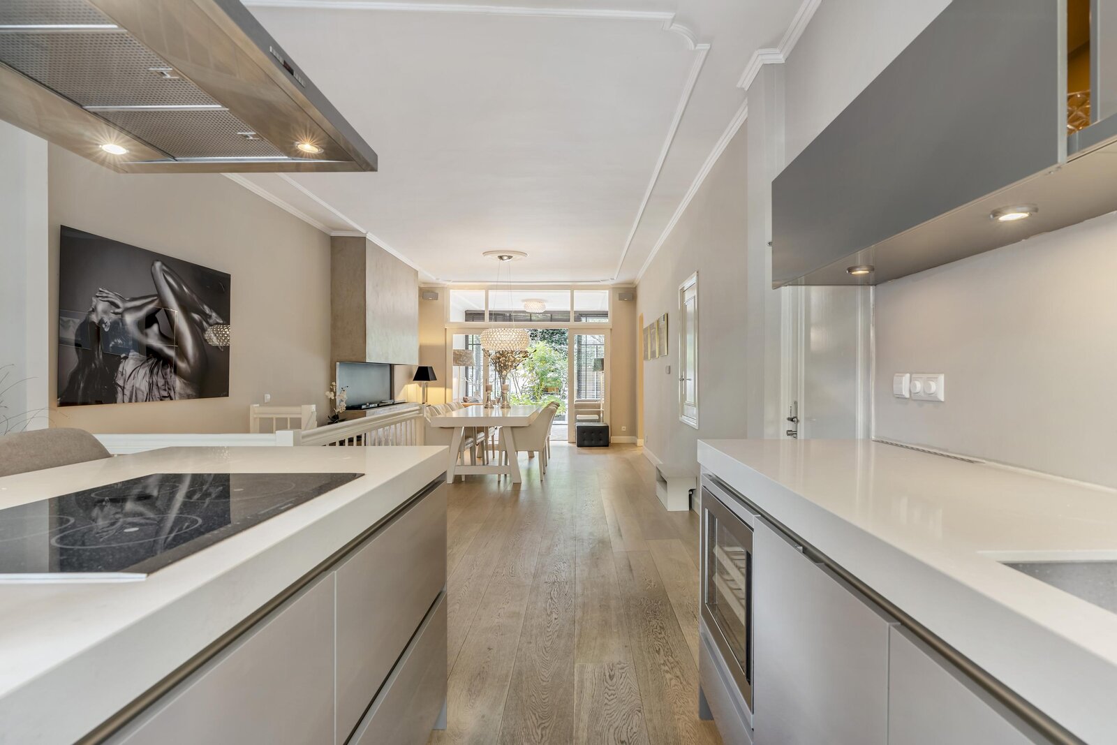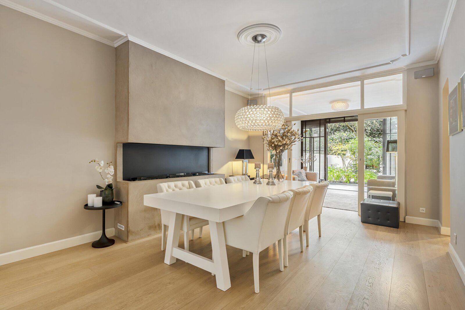 De entree op de begane grond leidt naar een royale, open leefruimte waarin keuken, eetkamer en woonkamer naadloos in elkaar overlopen. Aan de voorzijde bevindt zich de moderne keuken met kookeiland en hoogwaardige Gaggenau-inbouwapparatuur, centraal in de ruimte is plek voor een grote eettafel, en aan de achterzijde ligt de lichte woonkamer met openslaande deuren naar de tuin. De woonkamer kan desgewenst worden afgesloten met stijlvolle schuifdeuren, waardoor er een intieme en rustige zitkamer ontstaat.
