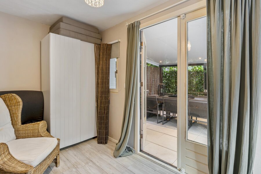 - Ruime tuin op het zuiden van ca. 71 m² met overkapping en tuinhuis van 8m2 voorzien van verwarming en elektra