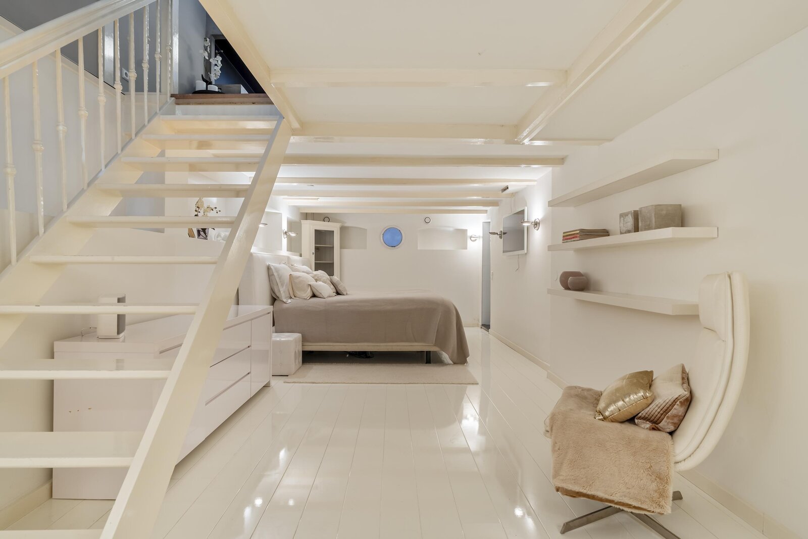 Via een interne trap is het souterrain bereikbaar, waar zich de riante slaapkamer bevindt met aangrenzende badkamer voorzien van inloopdouche en wastafel. Dankzij de slimme indeling en het ruime oppervlak is dit een comfortabele en rustige privéverdieping met voldoende bergruimte.