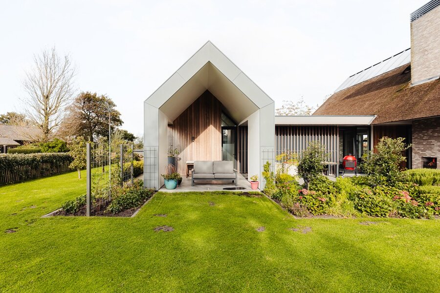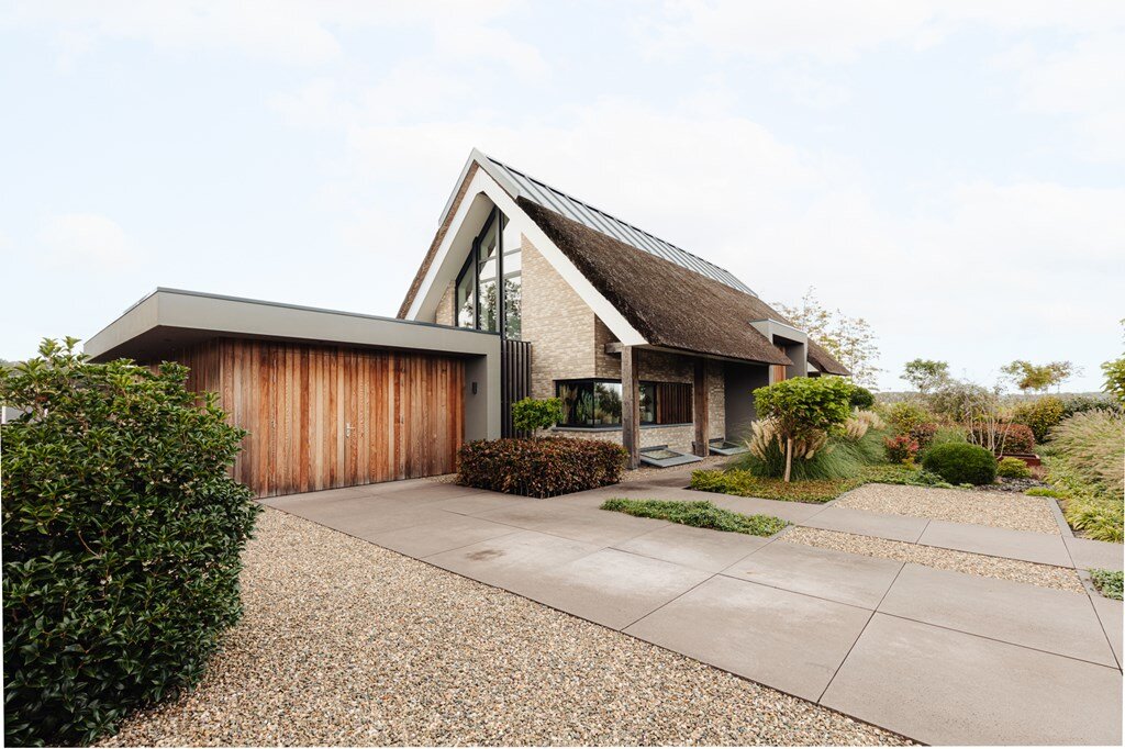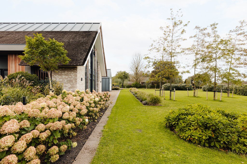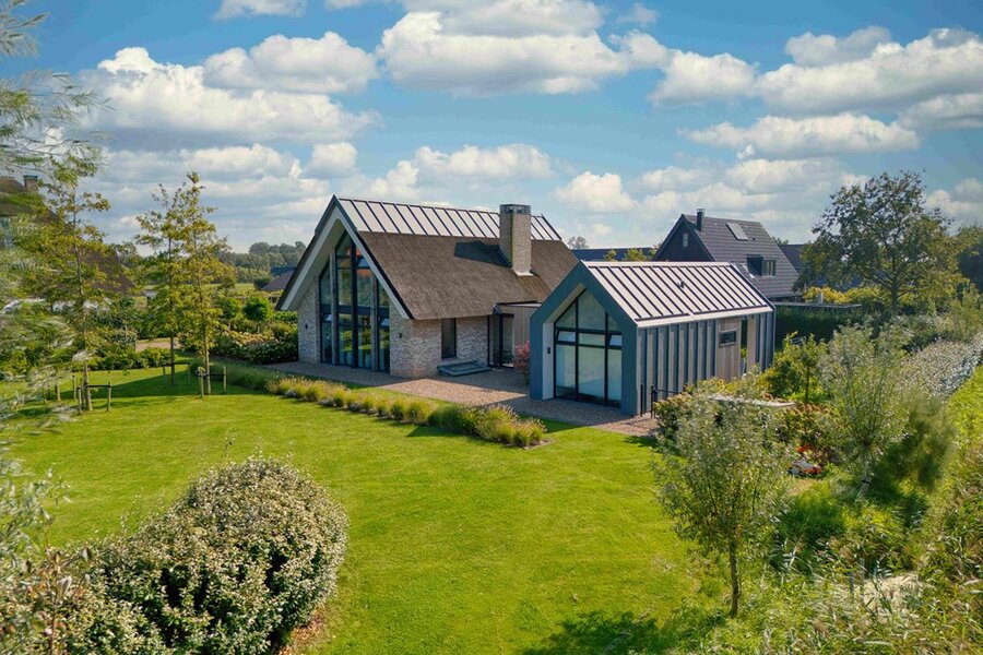 Groene Hof 1, Bergen – Moderne villa met karakteristiek rietgedekt dak, drie slaapkamers, twee badkamers, sauna en een royale tuin biedt levensloopbestendig wonen op een rustige, landelijke locatie net buiten Bergen.