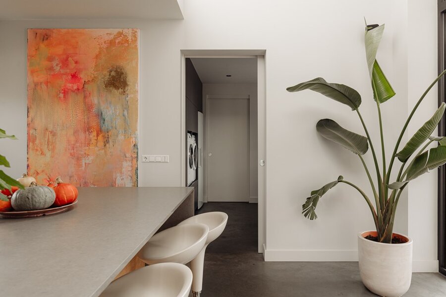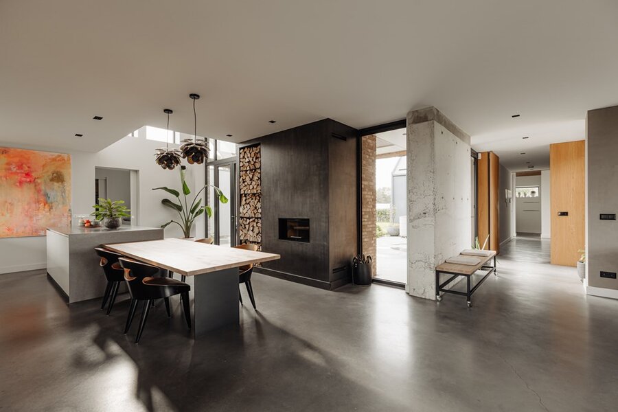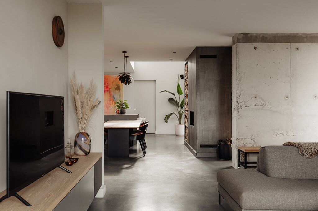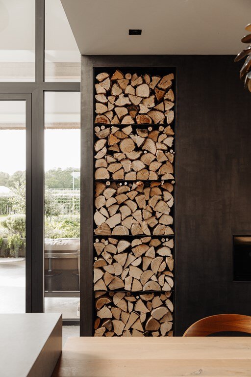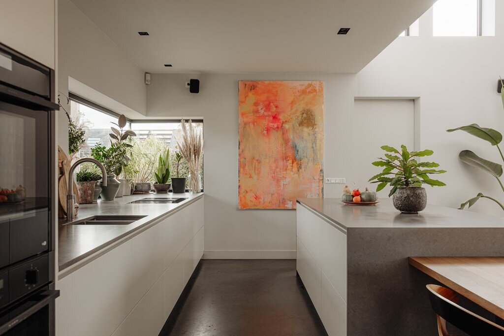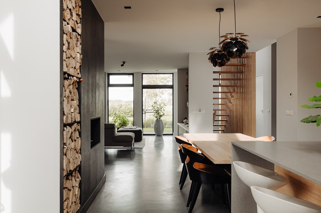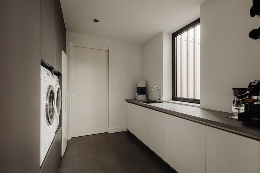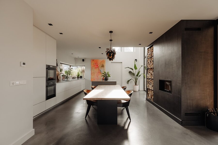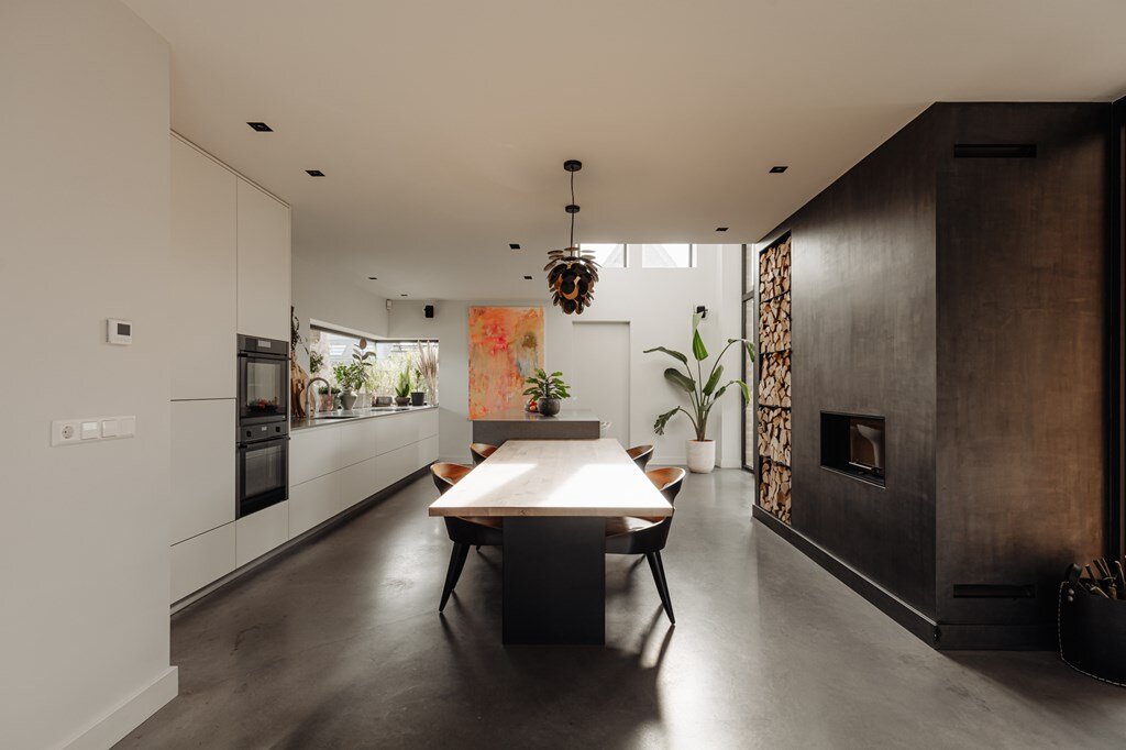 De leefkeuken vormt het hart van het huis – een plek waar familie en vrienden samenkomen. Met zicht op de tuin, een uitnodigende haard en een keuken die is uitgerust met hoogwaardige apparatuur, is dit een ruimte die uitnodigt tot samenzijn én culinaire creativiteit.
