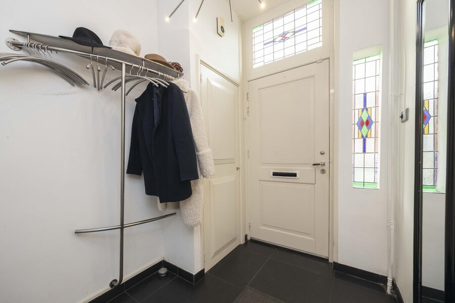 Bij binnenkomst wordt u ontvangen in de hal, waar de voordeur met glas- in- loodramen direct het karakter van de woning benadrukt. In de hal bevinden zich tevens de toiletruimte en de meterkast.