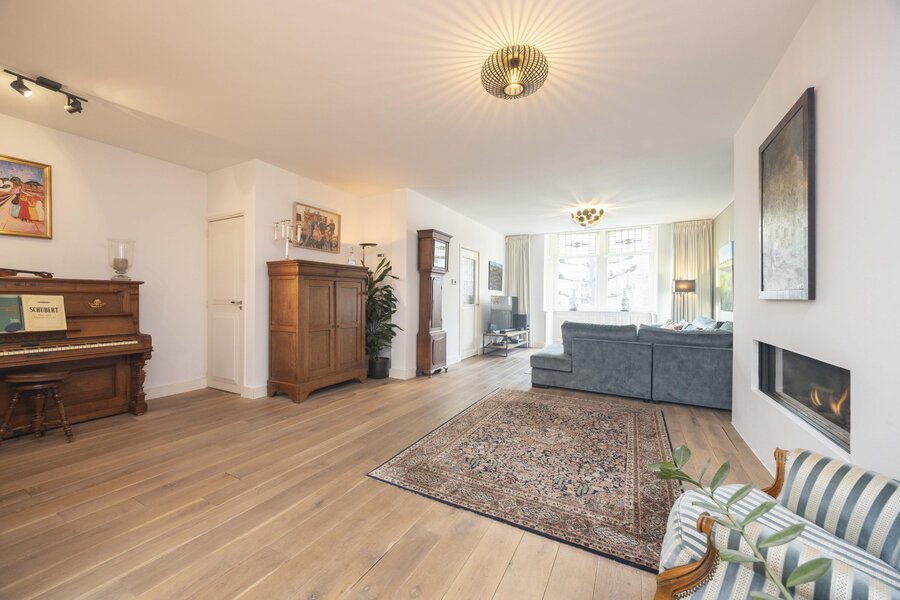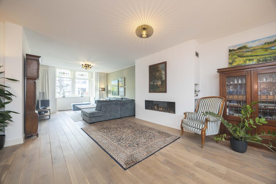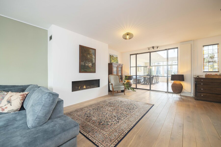 De tussendeur, eveneens uitgevoerd met glas in lood, geeft toegang tot de woonkamer. Deze ruimte is afgewerkt met een massief eikenhouten vloer en beschikt over een sfeervolle erker en een gashaard. Via een dubbele taatsdeur is de woonkeuken bereikbaar.