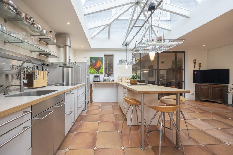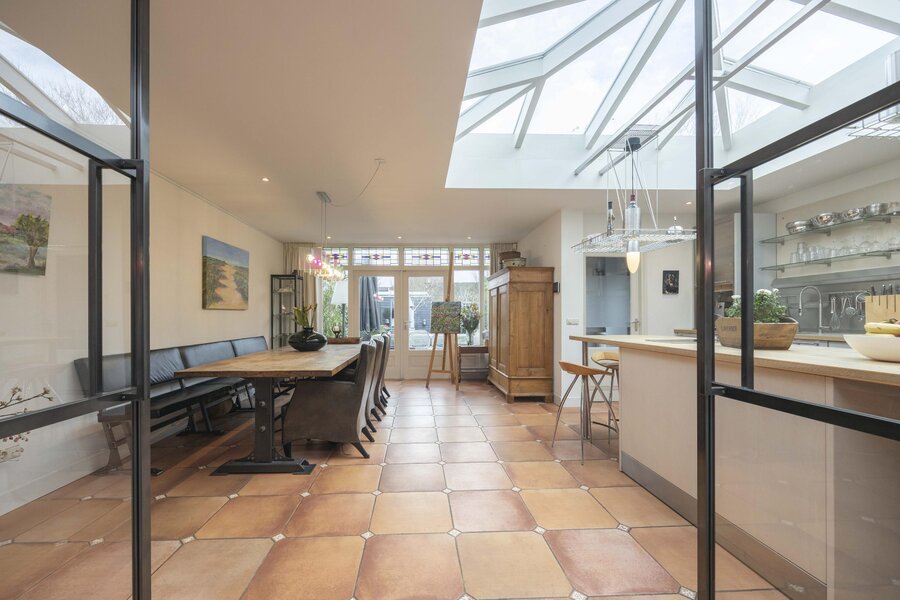 In de gehele aanbouw, waar de keuken en eetkamer zijn gesitueerd, is vloerverwarming aanwezig en is de vloer afgewerkt met een tegelvloer. Een groot lichtstraat zorgt voor een prettige hoeveelheid daglicht. Achter de keuken ligt de bijkeuken met een deur naar de achtertuin en de opstelling van de cv ketel.