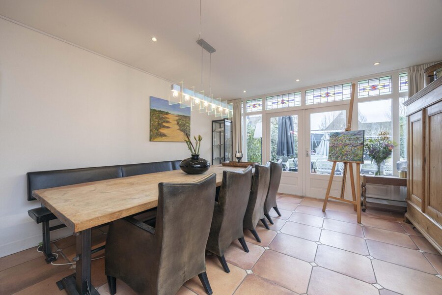 De woonkeuken is uitgevoerd in een hoogwaardige Bulthaup opstelling en voorzien van een oven, stoomoven, spoelbak, Quooker, inductiekookplaat met vijf zones en een afzuigkap. Het kookeiland met houten werkblad beschikt daarnaast over een koelkast in ladevorm en een extra inductiekookplaat met twee zones. Aansluitend bevindt zich de eetkamer met dubbele deuren naar de tuin.