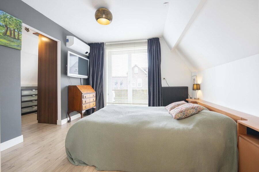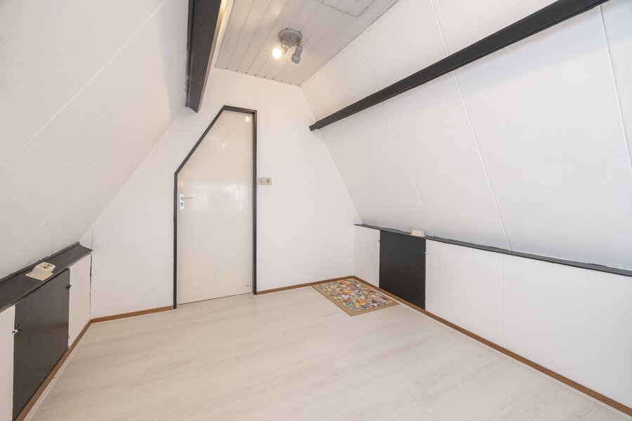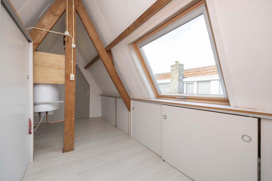 De overloop beschikt over praktische bergruimte achter het knieschot, een ingebouwde kast en de opstelling van de boiler. Daarnaast bevindt zich hier de vierde slaapkamer. Ook deze verdieping is afgewerkt met een laminaatvloer.