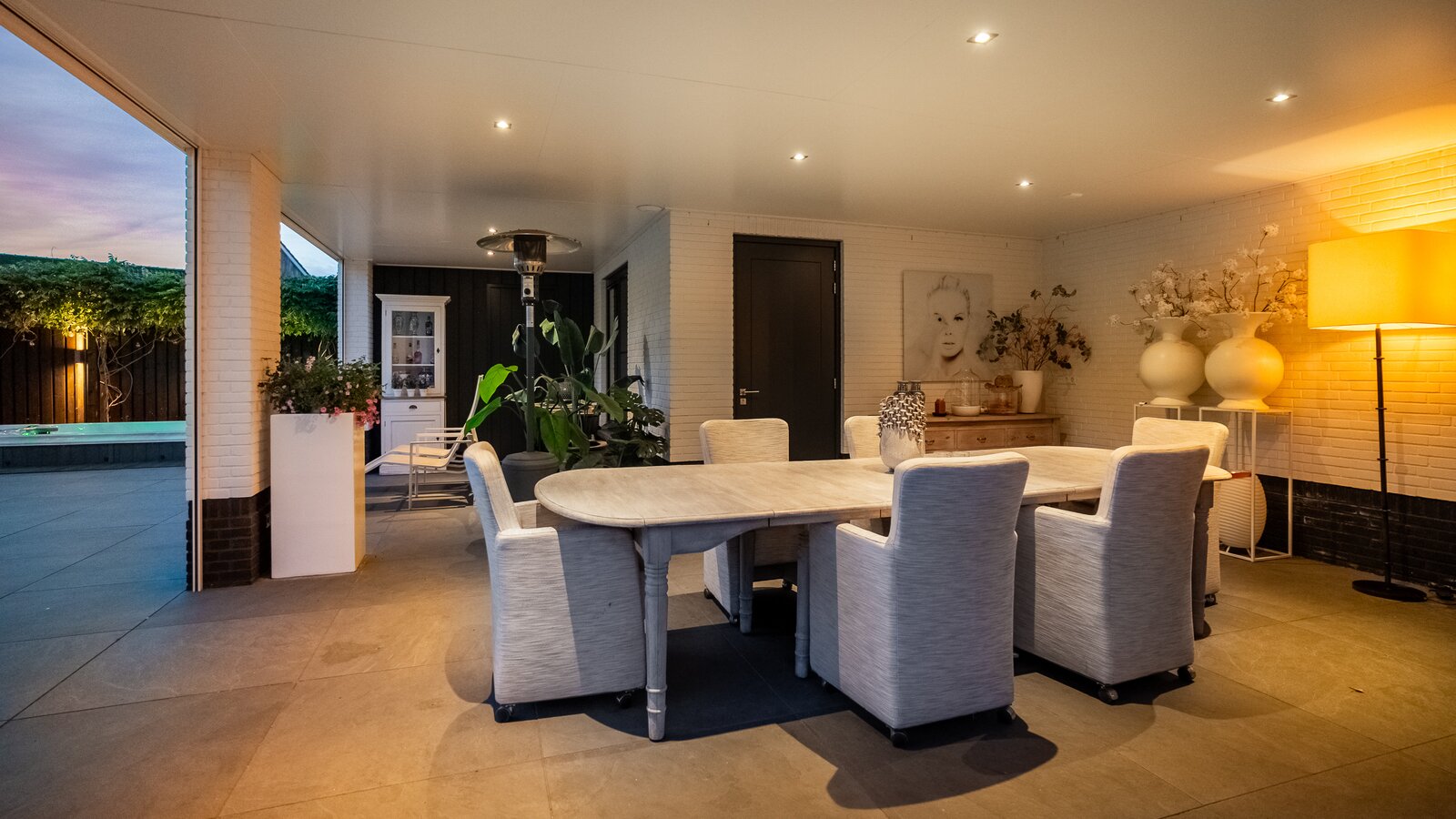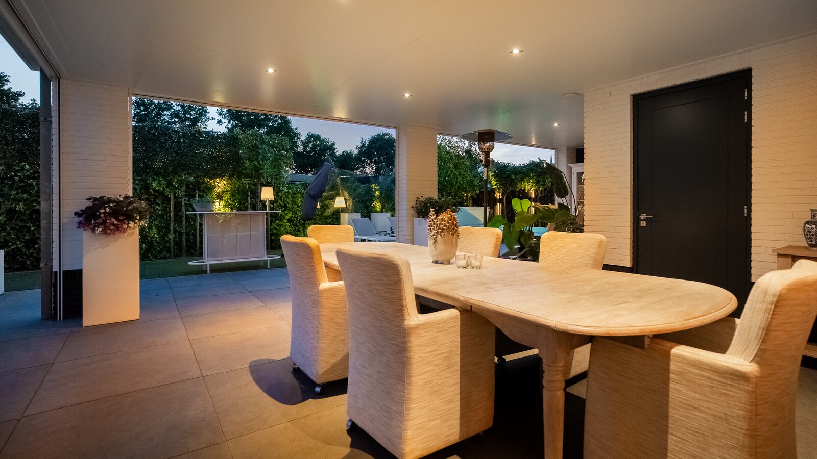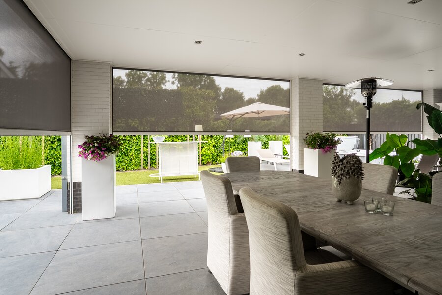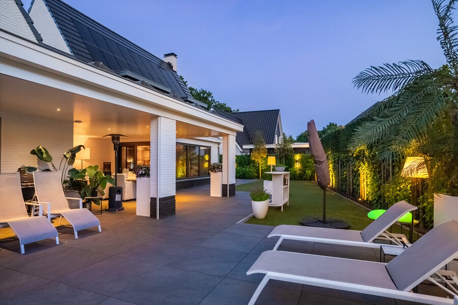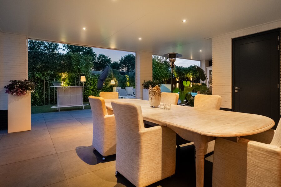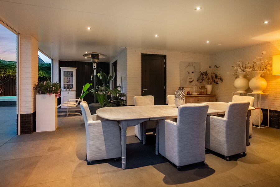 Buiten is het volop genieten onder de stijlvolle veranda, een verlengstuk van het woongenot – zomer én winter.