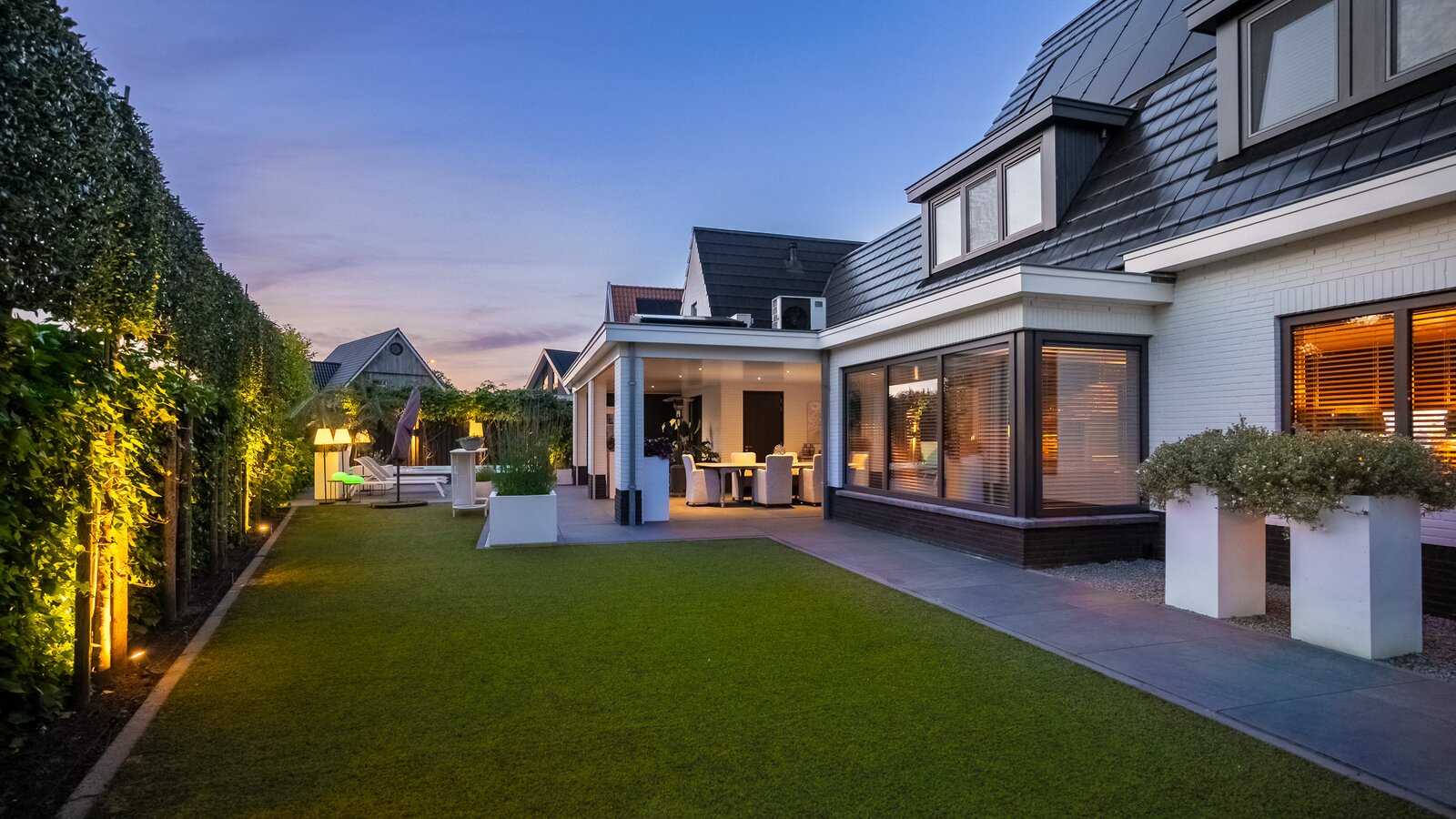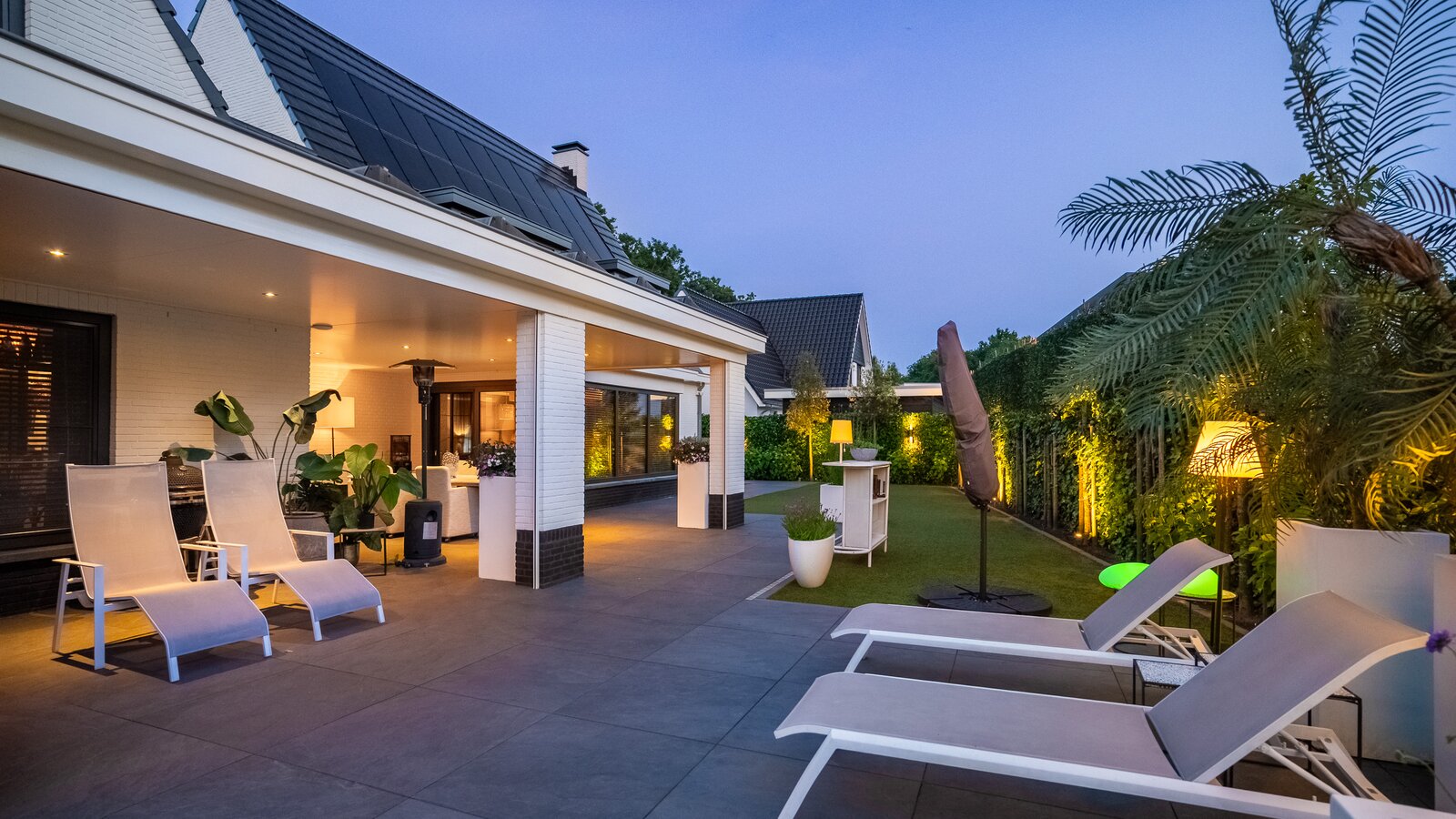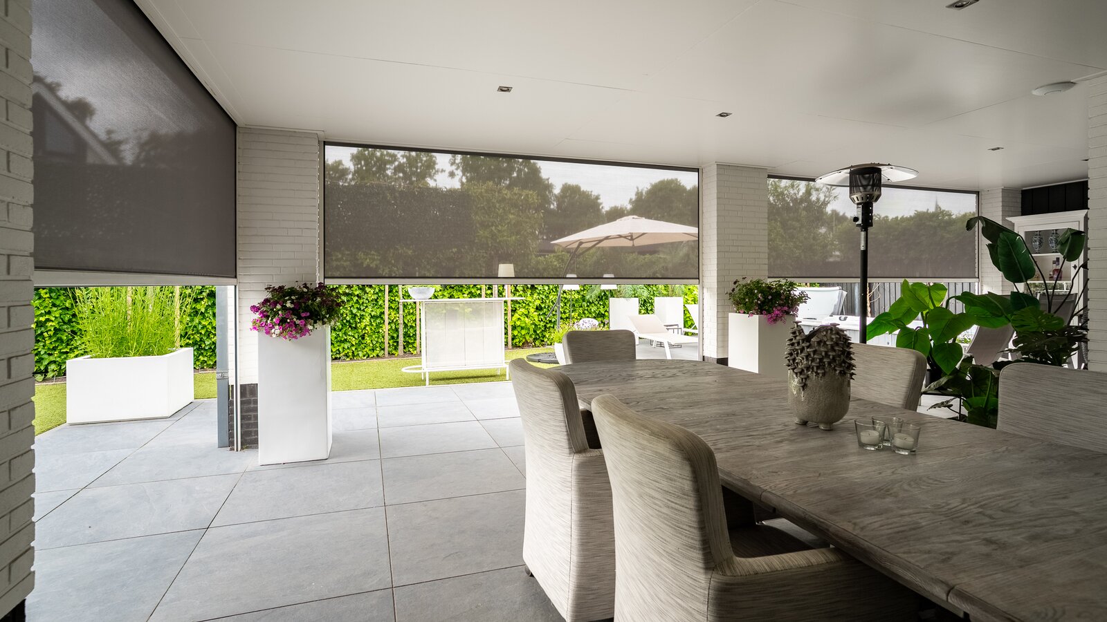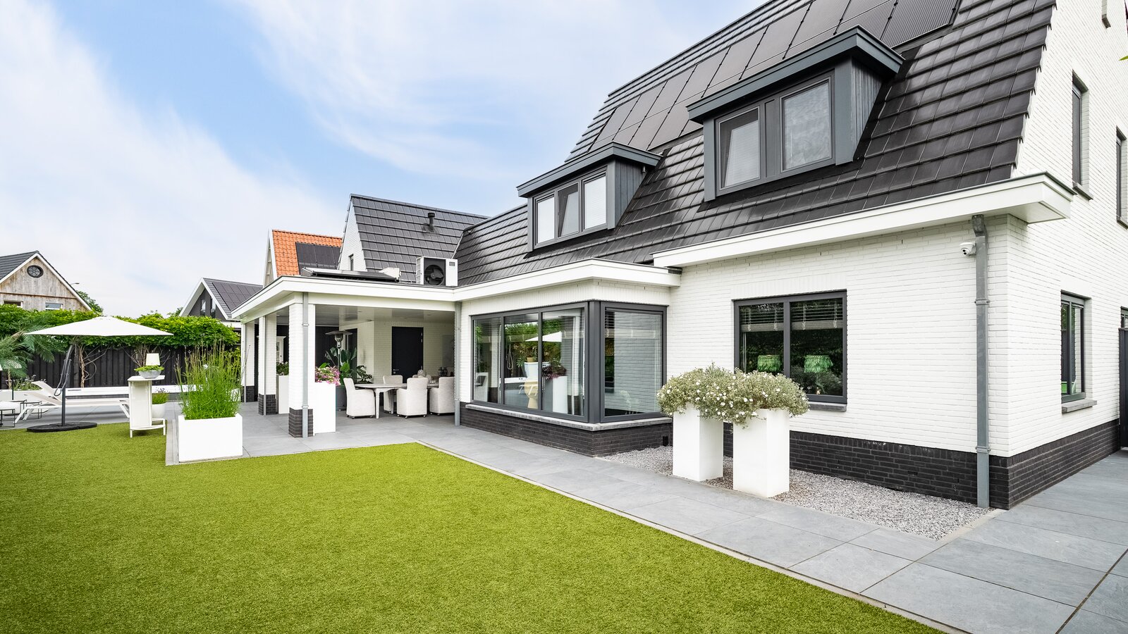 Buiten is het volop genieten onder de stijlvolle veranda, een verlengstuk van het woongenot – zomer én winter.