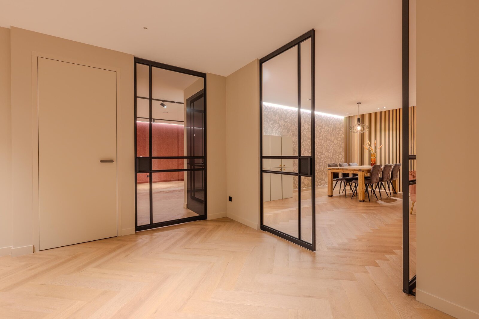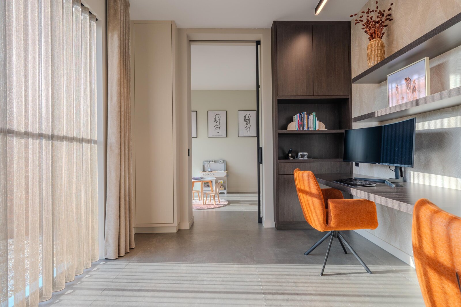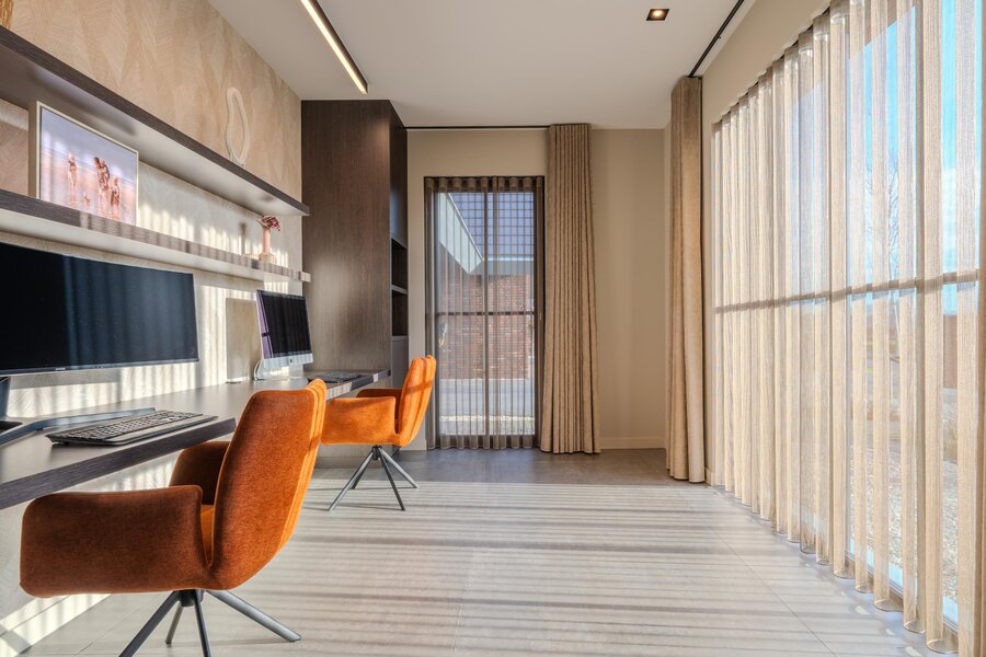 Aansluitend bevinden zich een fijne speelkamer (ook uitstekend in te richten als lichte leeshoek) en een royale werkkamer met maatwerk bureau en kastruimte, geschikt voor meerdere thuiswerkplekken. Dankzij de glazen schuifdeuren zijn deze ruimtes flexibel te gebruiken.